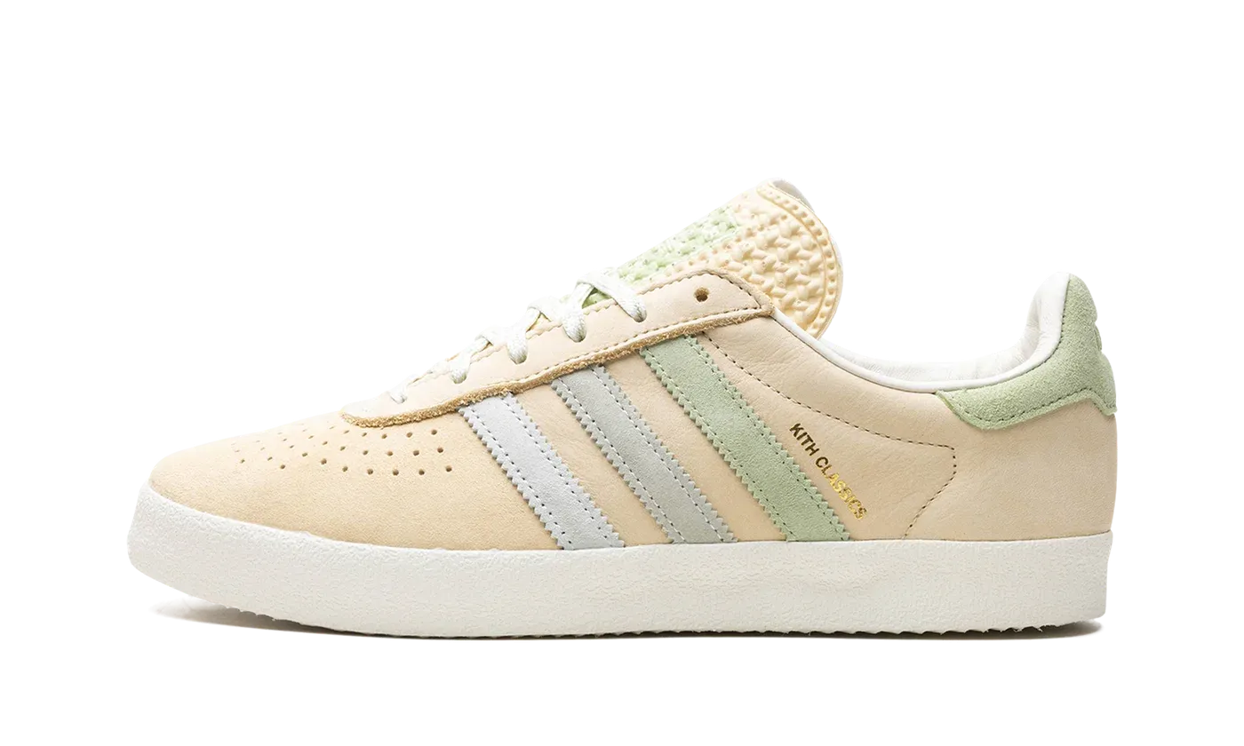 The Kith x adidas AS350 "Classics Program - Arctic Fusion" is a collaboration between Ronnie Fieg's sneaker boutique and adidas on the classic shoe. The adidas AS350 is a retro that was originally made strictly for the Japanese market in the late 1970s and early 1980s. The model returned via collaborations with Kith in 2024. The "Arctic Fusion" colorway has a Pale Yellow leather construction with gradient blue and green suede Three Stripes on the sides. A gold "Kith Classics" logo is stamped on the lateral side of the shoe, and "Kith" and "adidas" logos appear on the left and right heel tab, respectively. A white vulcanized rubber sole completes the look.