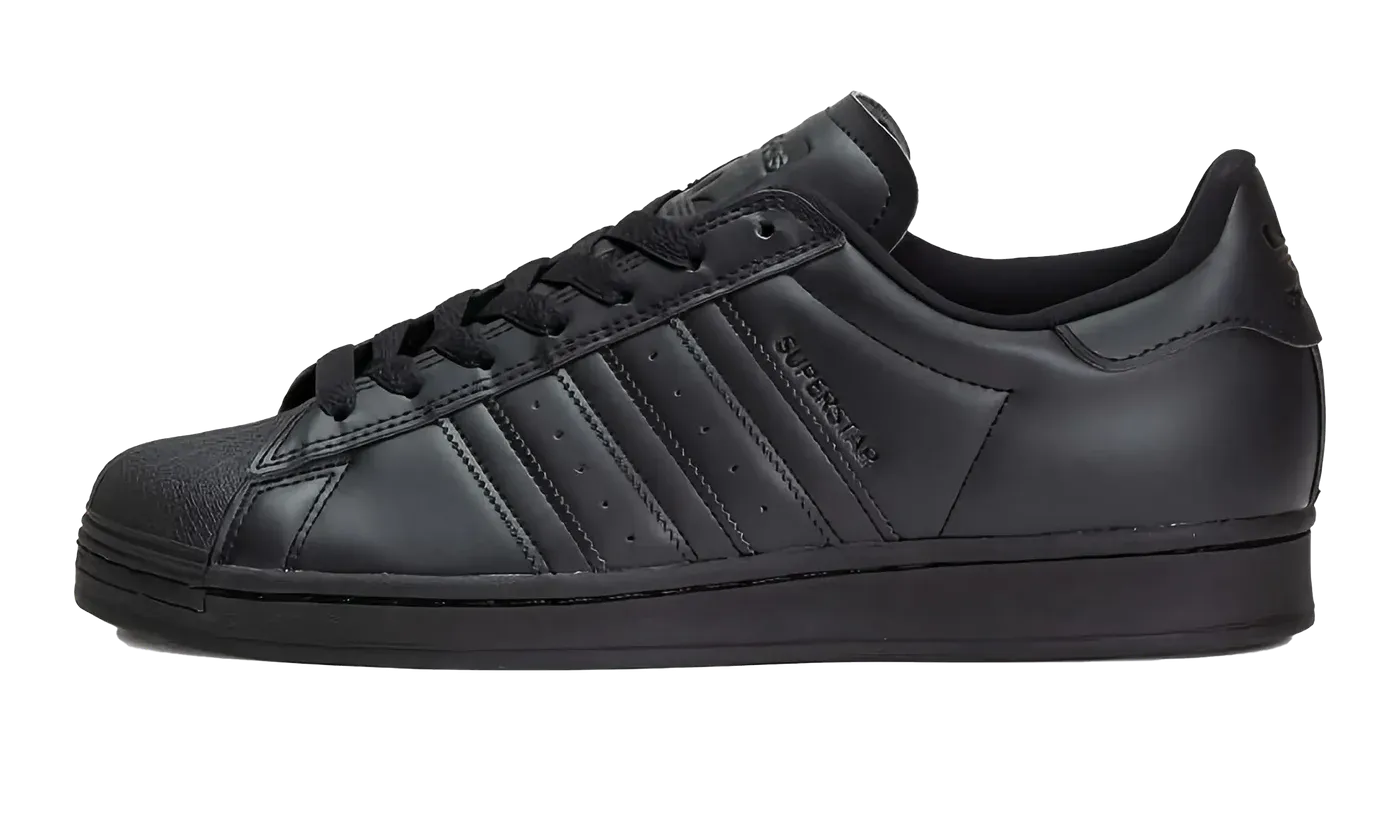 The Superstar ADV 'Black' shoe features a classic design in an all-black colorway, offering a versatile and timeless addition to any sneaker collection.
