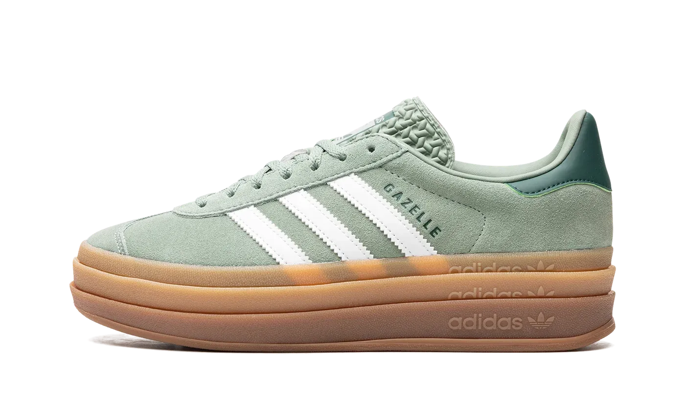 The Women's adidas Gazelle Bold "Silver Green/Gum" is a women's-exclusive colorway of the modified version of the retro sneaker with a stacked, platform-style sole. A contemporary spin on the adidas Gazelle, the model's Bold edition turns heads with a raised sole that provides significant height to the wearer. As for the rest of the design, the shoe has a Silver Green-colored suede upper with white leather Three Stripes on the sides. Debossed "Gazelle" branding is found on the lateral side of the shoe. A green "adidas Gazelle" logo lands on the tongue. The exaggerated platform sole is designed in a gum rubber hue. Release date: October 1, 2023