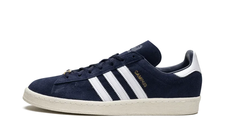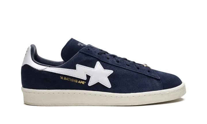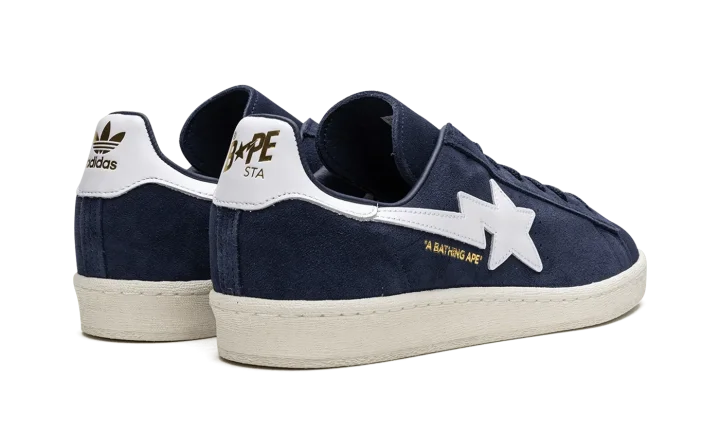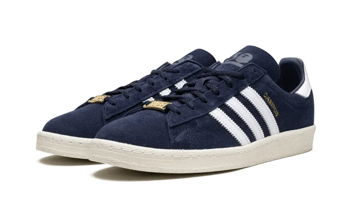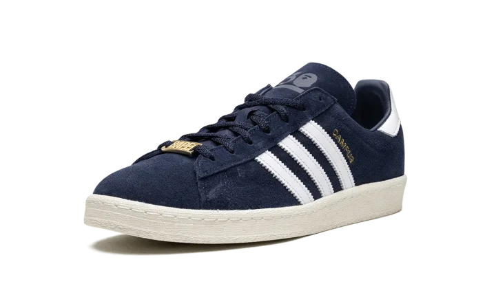 The BAPE x adidas Campus 80 "Collegiate Navy" is a collaboration between the Japanese streetwear brand and adidas on the retro-inspired lifestyle shoe. Celebrating BAPE's 30th anniversary, the adidas Campus 80 in the "Collegiate Navy" colorway features a navy blue suede upper with contrasting white BAPE Sta and Three Stripes branding on the lateral and medial side of the shoe, respectively. An adidas logo appears on the heel of the left shoe and a BAPE logo is found on the heel of the right shoe. A gold "BAPE" lace dubrae gives the shoe a luxurious vibe.