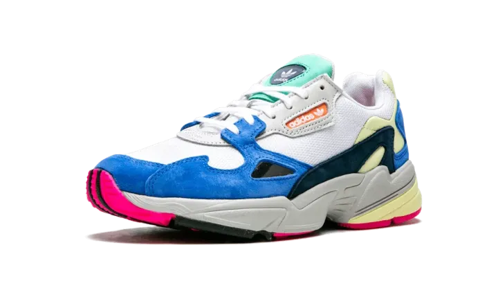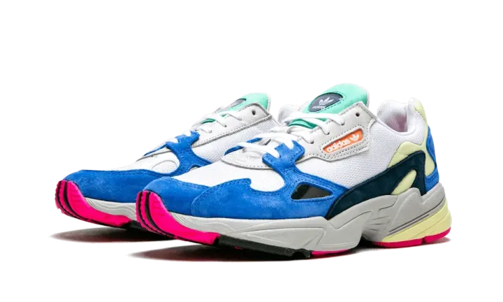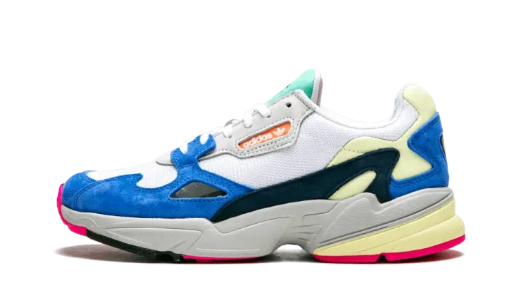 The adidas Falcon W "Cloud White/Blue" is a stylish colorways of the premium silhouette by adidas Originals. Specifically for women, the Falcon combines a vintage running shoe aesthetic with elevated materials and unique color combinations for a style-driven sneaker for modern times. The adidas Falcon W "Cloud White/Blue" features a mix of neutral and vibrant tones, including a white mesh base with bright blue suede overlays and muted yellow, hot pink, light green, and coral orange accents throughout the upper and sole. A metallic accent at the toe completes the eye-catching look.
