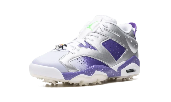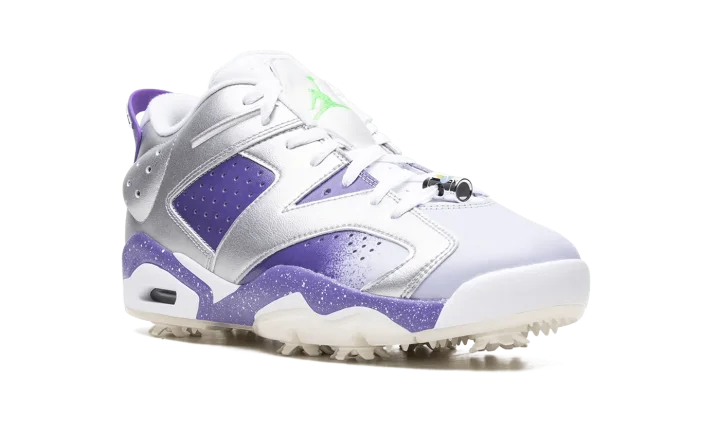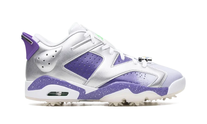 The Air Jordan 6 Low Golf "U.S. Open" is the alternate golf version of the sixth Air Jordan that celebrates the PGA Championship. The Jordan 6 Low Golf "U.S. Open" features a purple airbrush effect with Metallic Silver leather overlays throughout the design. A silver Jumpman is embroidered on the back of the shoe while a neon green Jumpman is embroidered on the tongue overlay. The mid-panel is painted purple with white speckle detailing. Underfoot, nubs on the outsole provide traction on a golf course. Release date: June 16, 2023