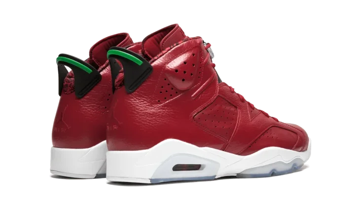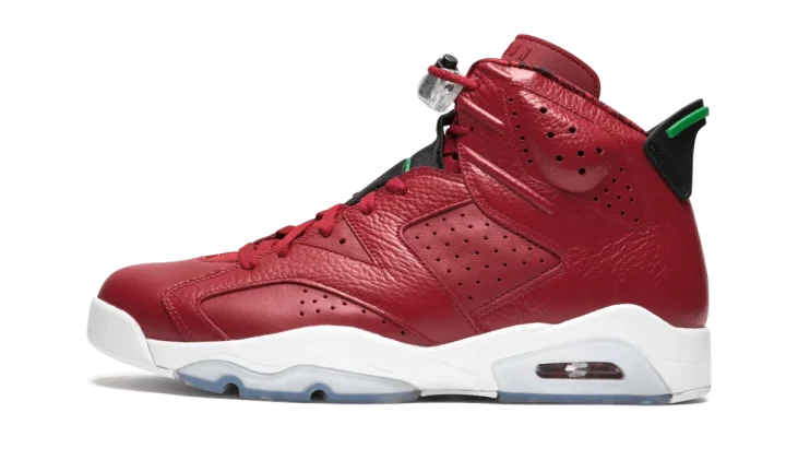 An homage to the original Air Jordan Spiz'ike, the popular hybrid retro model by Spike Lee, this Air Jordan 6 gets a colorway inspired by the original Spiz'ike colorway, but with a fully red upper and green and white accents. The original Spiz'ike graphic print adorns the inner lining.