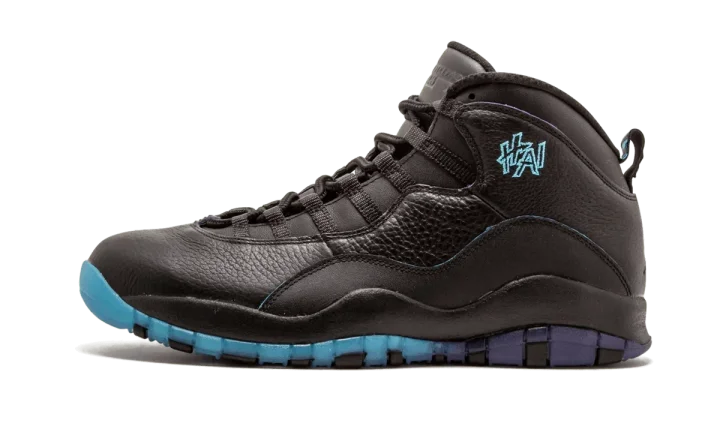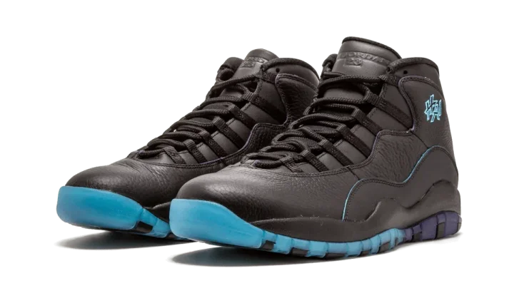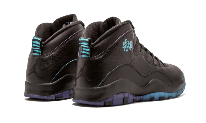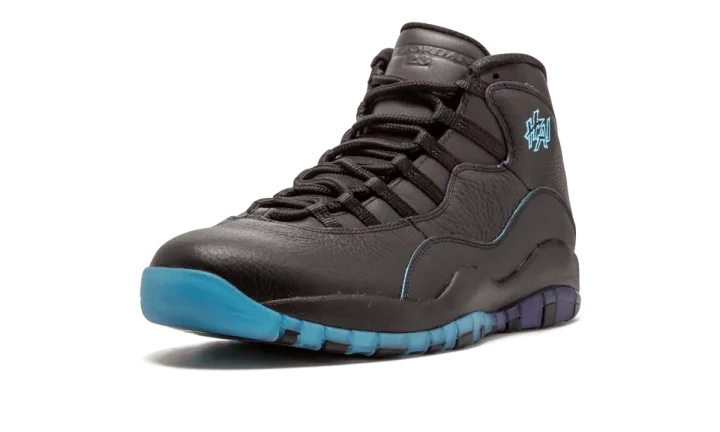 Black/gamma blue/fierce purple leather Air Jordan Retro 10 "Shanghai" sneakers from jordan featuring round toe, flat rubber sole, front lace-up fastening, branded insole and ankle length. These styles are supplied by a premium sneaker marketplace. Stocking only the most sought-after footwear, they source and curate some of the most hard to find sneakers from around the world.