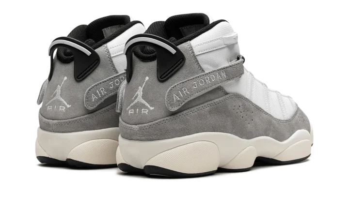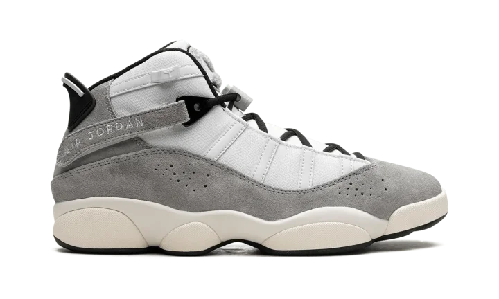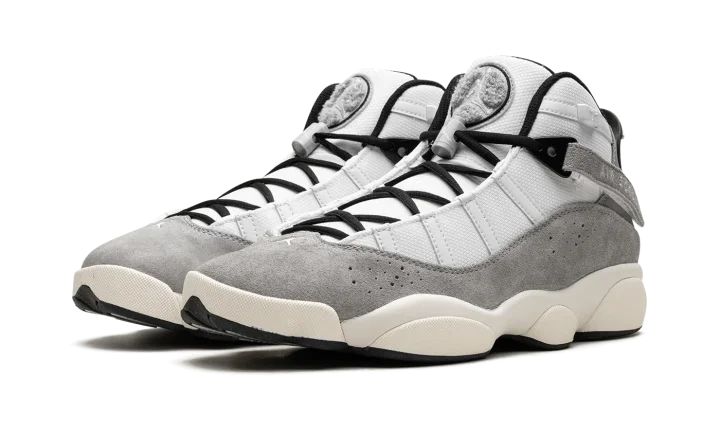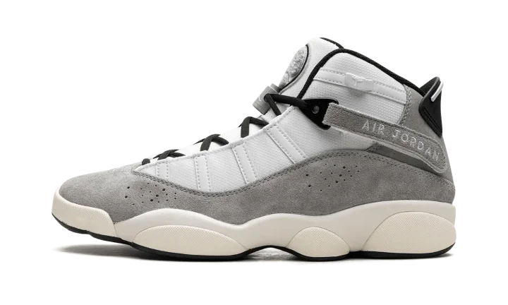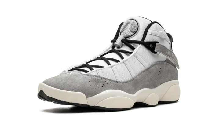 The Jordan 6 Rings "Cement Grey" is a neutral colorway of the hybrid sneaker that fuses elements of several classic Air Jordan sneakers. Debuted in the 2000s, the Jordan 6 Rings features elements of the Jordan models that were worn by Michael Jordan when he won his six NBA Championships with the Bulls in the 1990s. The "Cement Grey" features a white mesh upper with a Cement Grey suede mudguard. A grey chenille Jumpman patch, inspired by the Air Jordan 8's design, appears on the tongue. Other features inspired by the Jordan 8 as well as the Air Jordan 11 and Air Jordan 12 complete the design. An icy blue translucent outsole sits below. Release date: June 8, 2023