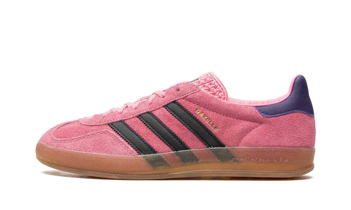 The Women's adidas Gazelle Indoor "Bliss Pink/Purple" is a women's colorway of the retro indoor soccer sneaker with a can't-miss appearance. The adidas Gazelle Indoor in "Bliss Pink/Purple" features a Bliss Pink suede construction with a tonal suede overlay on the toe. Contrasting black leather Three Stripes and gold "Gazelle" branding can be seen on the side of the shoe. A purple leather heel tab adds a contrast of color to the shoe's mostly pink upper. Underfoot, a semi-translucent gum rubber sole completes the design.