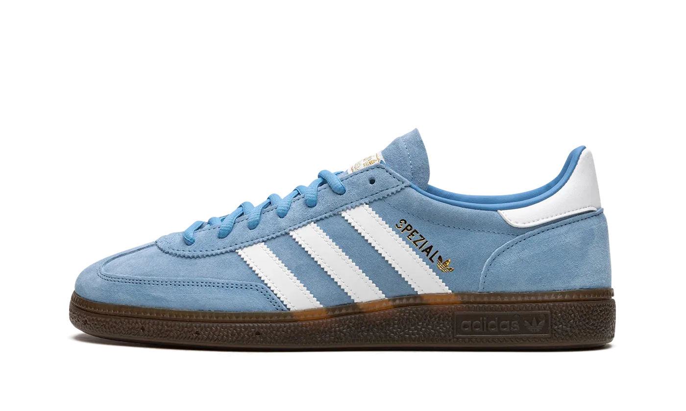 The adidas Handball Spezial "Light Blue" is an eye-grabbing colorway of the sneaker inspired by 1980s-era soccer shoes. The Handball Spezial in "Light Blue" is constructed with a light blue suede upper with white Three Stripes branding on the sides. Gold "Spezial" and adidas logos are seen on the lateral side of the mid-panel. A white leather overlay is seen on the heel. Classic adidas Handball Spezial branding is printed in gold lettering on the tongue. A gum rubber sole completes the look. Release date: February 18, 2019