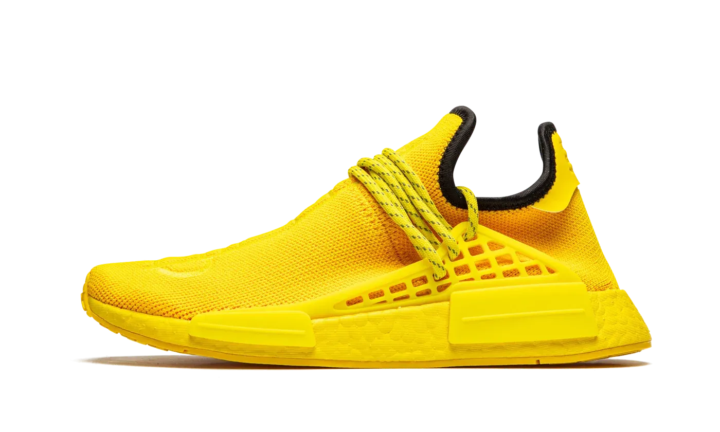 The Pharrell x adidas Hu NMD "Bold Gold" is a November 2020 release of Pharrell Williams' popular shoe in an all-yellow-everything colorway. The "Bold Gold" is indeed as exuberant as its nickname implies. The entire upper wears an attention grabbing yellow Primeknit material that is both lightweight and breathable. Tonal Hindi text embroidered on the top of both shoes translates to "Human Race." Additional design elements include striped yellow rope laces that are held in place by a tonal supportive TPU caging system that is anchored by midsole inserts. Dual adidas and Pharrell branding can be found on the heel of the left and right shoe, respectively. A black liner and yellow-tinted Boost foam midsole complete the look of this exciting look for the Pharrell x adidas Hu NMD. Release date: November 7, 2020.