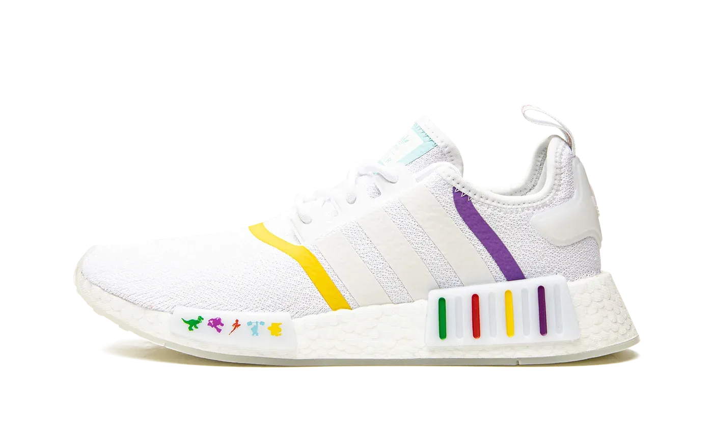 The Disney Pixar x adidas NMD R1 "Toy Story" is a Summer 2021 collaboration between the popular animation studio and adidas on the retro-modern lifestyle shoe. A collection of popular characters from the film "Toy Story" appear on the white forefoot midsole plug on this NMD R1, including icons like Buzz Lightyear and Rex. The upper features a white Primeknit construction with contrasting colors appearing on the tape that surrounds the tonal Three Stripes branding. Dual Disney Pixar and adidas branding is found on the tongue. Multicolor stripes adorn the plug located on the heel of the white Boost foam midsole. Release date: July 15, 2021