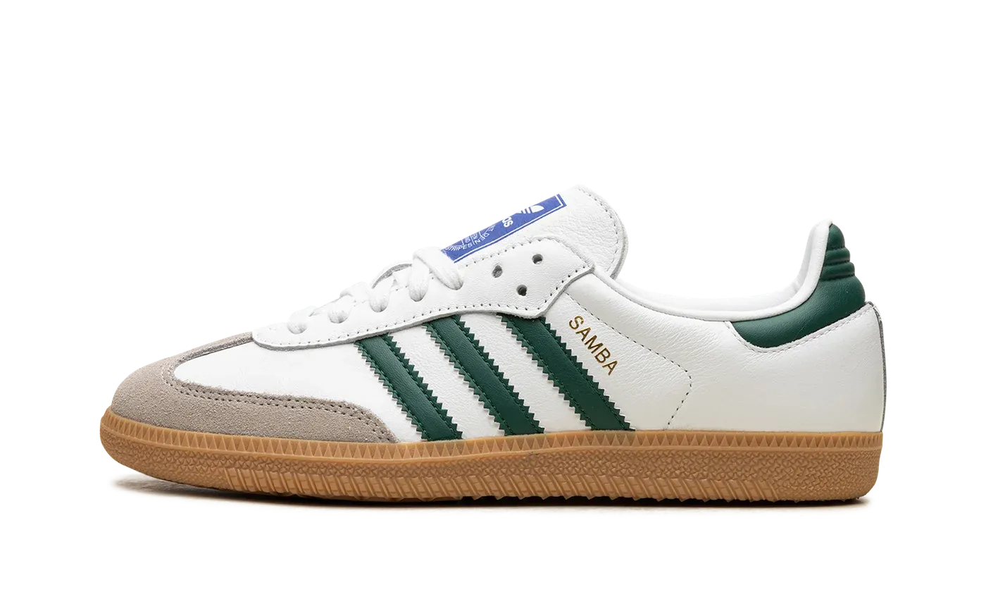 The adidas Samba OG "Collegiate Green" is a colorway of the retro shoe with green accents. The upper features a white leather base contrasted with a grey suede overlay on the toe, and a green leather panel on the heel tab. Collegiate Green leather Three Stripes appear on the sides, while a gold foil "Samba" logo can be seen on the lateral side of the mid-panel. Classic adidas Samba detailing is printed on the tongue. A gum rubber sole completes the look.