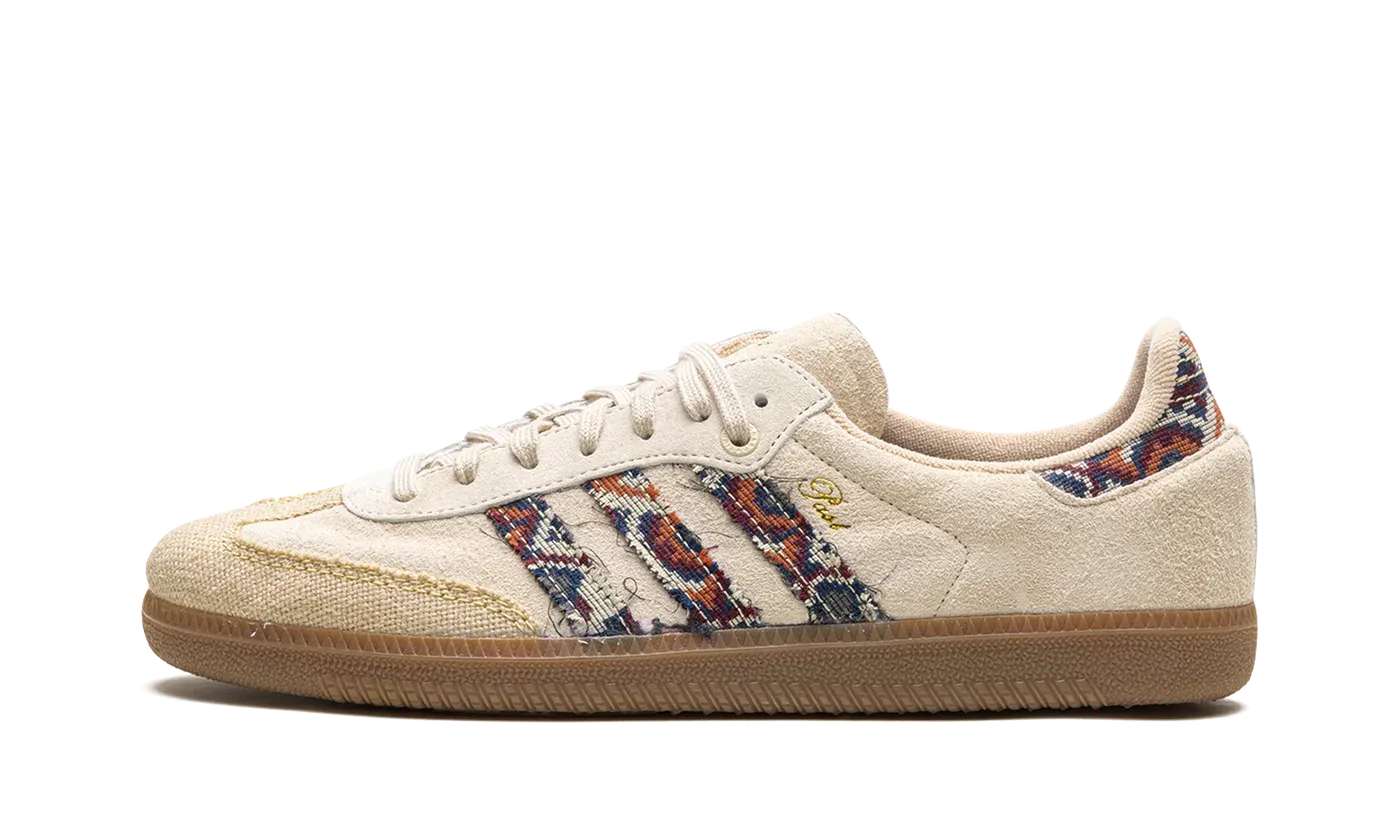 The END x adidas Samba "Past" is a collaboration by the retailer and adidas on a colorway of the retro indoor soccer shoe inspired by historical materials. The adidas Samba "Past" was part of adidas's fan-judged Consortium Cup contest before it was released to the public. As for its design, the shoe features a cream-beige hairy suede construction with a heavy, durable tonal-colored fabric on the toe. A tapestry-like pattern on the heel and on the Three Stripes branding on the sides. "Past" replaces "Samba" branding on the lateral side of the mid-panel and co-branding is seen on the tongue. A gum rubber sole completes the look. Release date: November 23, 2023