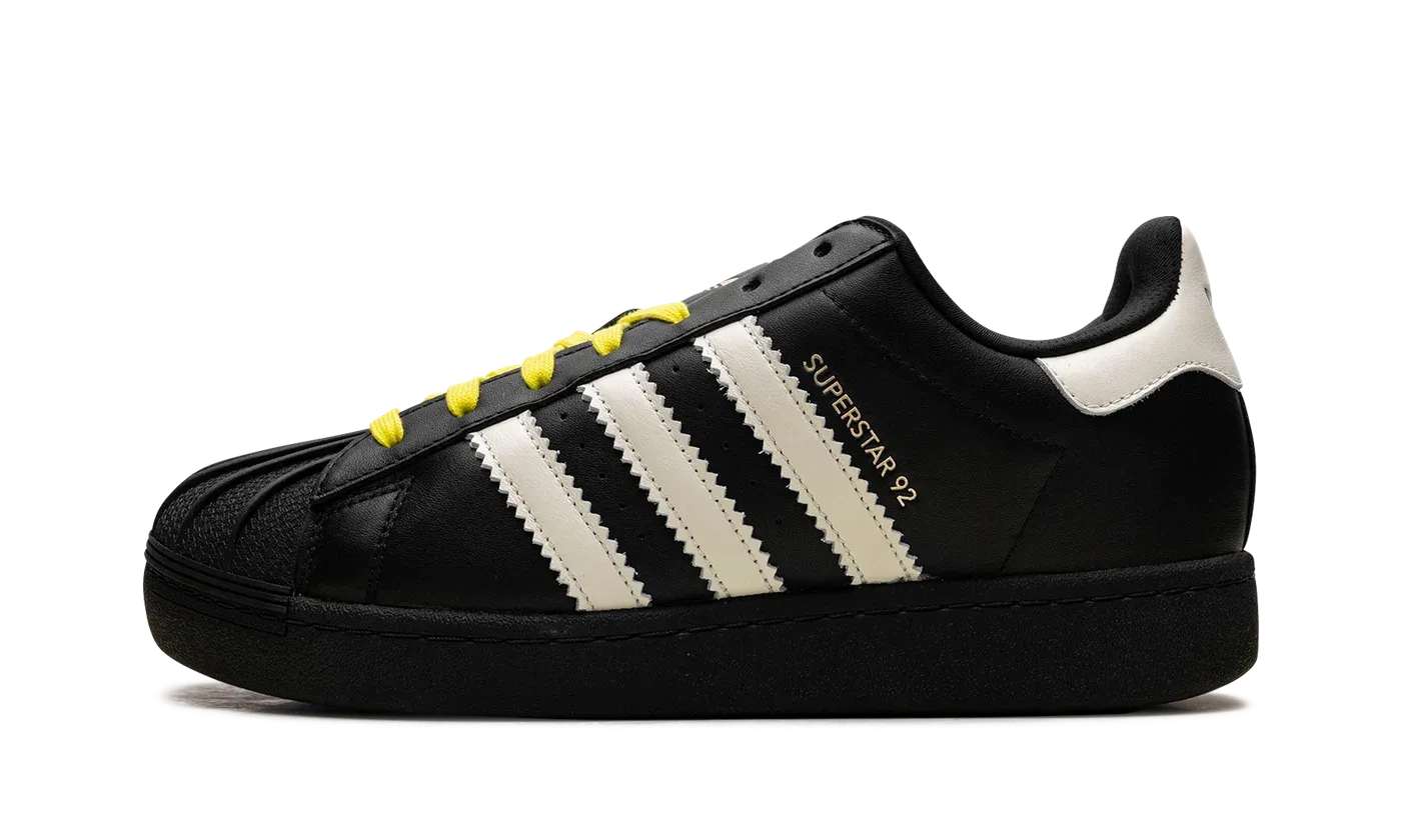 The Superstar 92 'Pharrell - Virginia Black' shoe blends classic Adidas Superstar style with a unique design inspired by Pharrell Williams, featuring a sleek Virginia Black aesthetic.