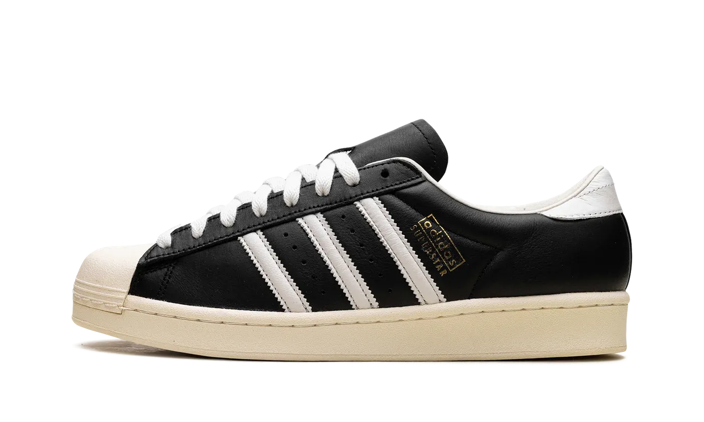 The Superstar Vintage 'Black / White / Antique' shoe features a classic design with a vintage aesthetic, offering a timeless addition to any sneaker collection.