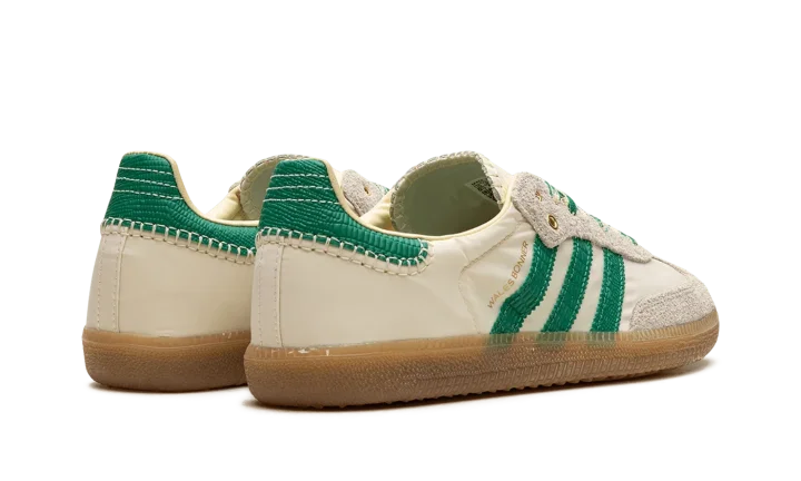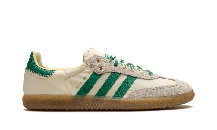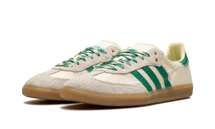 The Wales Bonner x adidas Samba "Cream/Green" is a collaboration by the talented fashion designer on the popular sneaker with intricate details. Yet another hyped release by Wales Bonner and adidas, the Samba seen here in "Cream/Green" features a cream-colored upper with contrasting green Three Stripes and "Wales Bonner" branding on the side. The eye-pleasing design has more green accenting on the heel tab as well as on the laces blended with cream. Hairy grey suede can be found on the toe and eyelets. Underfoot, a gum rubber sole completes the look.