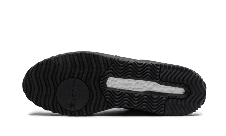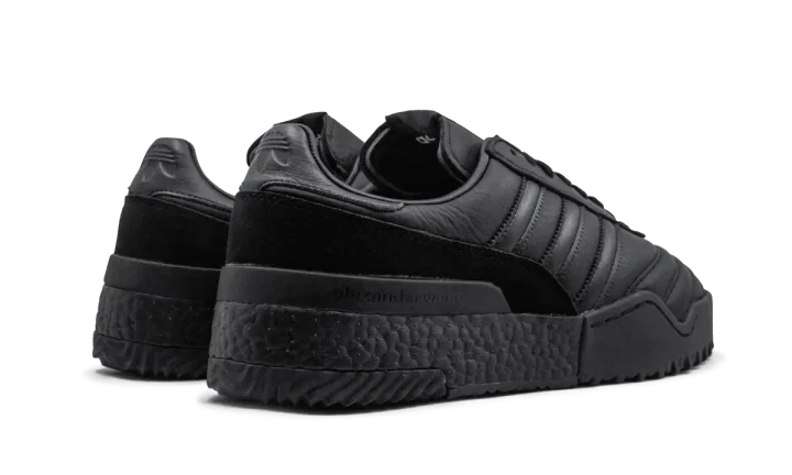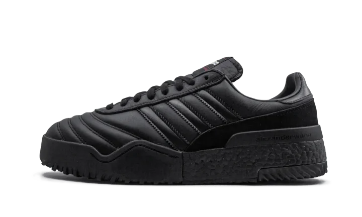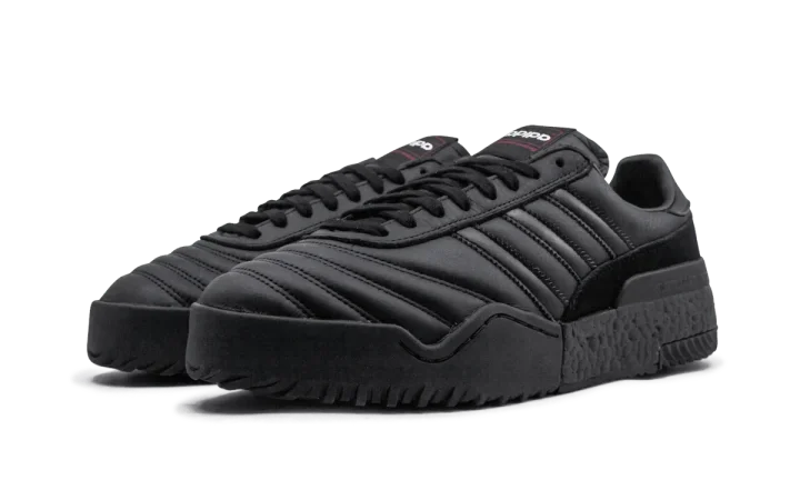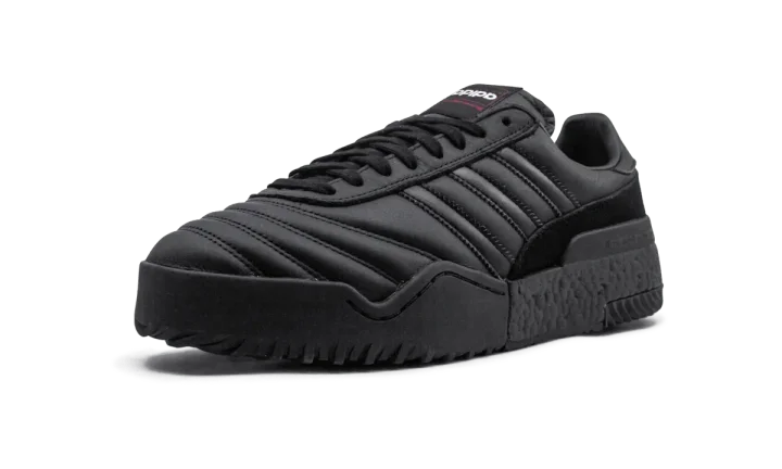 The Alexander Wang x adidas Bball Soccer shoe introduces high-fashion design to the adidas Bball silhouette, as part of the famous collaboration between fashion designer Alexander Wang and adidas. For this collection, Wang zeroed in on a "factory imperfection" theme. The amped-up lifestyle silhouette is made with a triple-black application of leather and suede materials on the upper and a thick midsole with black Boost cushioning. Unexpected details include upside-down adidas branding on the tongue tag, side, and heel.