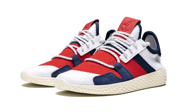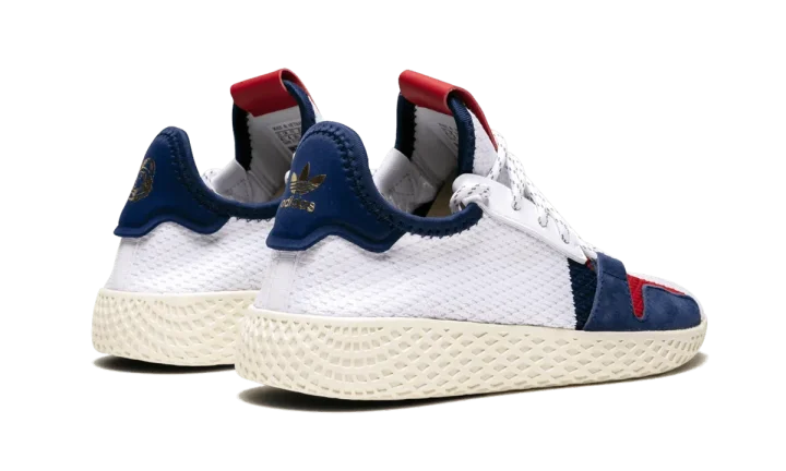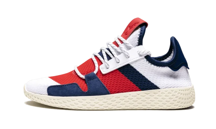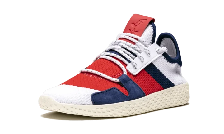 The Pharrell x adidas BBC Tennis Hu V2 "White/Red/Blue" is an eye-catching colorway of Pharrell Williams's second edition of the Tennis Hu. Adding new detail and dimension to the original design by upgrading the upper with paneling at the forefoot and lace eyestay, this edition also gets a colorful makeover from Billionaire Boys Club. The Tennis Hu V2 has a white, red, and blue striped pattern across the textile upper. Striped laces, gold foil dual branding on the heels, and an cream shade for the foam sole add the final touches to the clean look.