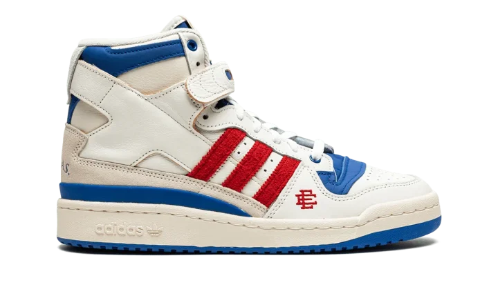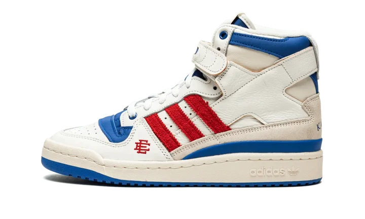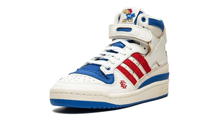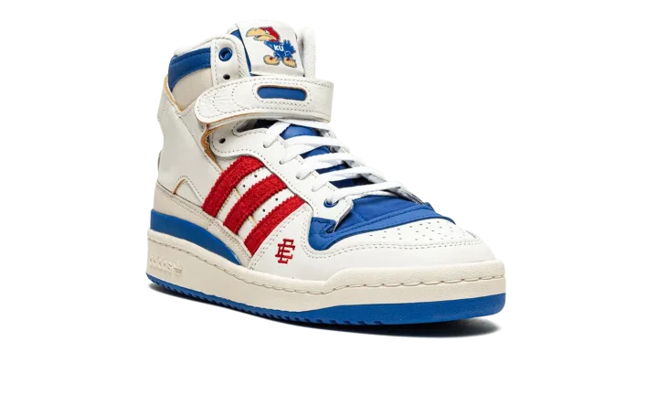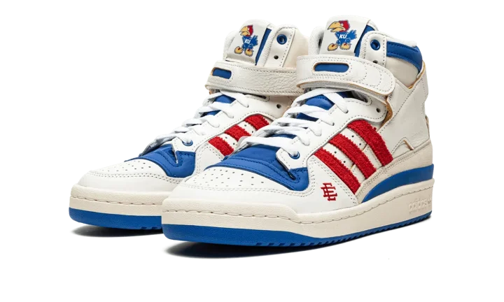 The Eric Emanuel x adias Forum 84 Hi "Kansas Jayhawks" is a collaboration by the New York based fashion designer on the vintage basketball shoe in a colorway dedicated to the Kansas Jayhawks. Emanuel's collaboration on the Forum 84 Hi in the "Kansas Jayhawks" colorway is one of several college basketball makeups of the shoe released in 2021, which includes styles made up in the honor of the Louisville Cardinals and Indiana Hoosiers. The "Kansas Jayhawks" features mostly light cream-colored leather with tonal overlays. A red felt Three Stripes branding appears on the sides. "Kansas" branding in blue is found on the sand-colored suede heel overlay. Additional iconography exclusive to the Kansas Jayhawks college basketball team appears in the form of the school's mascot, Big Jay, on the tongue tag.