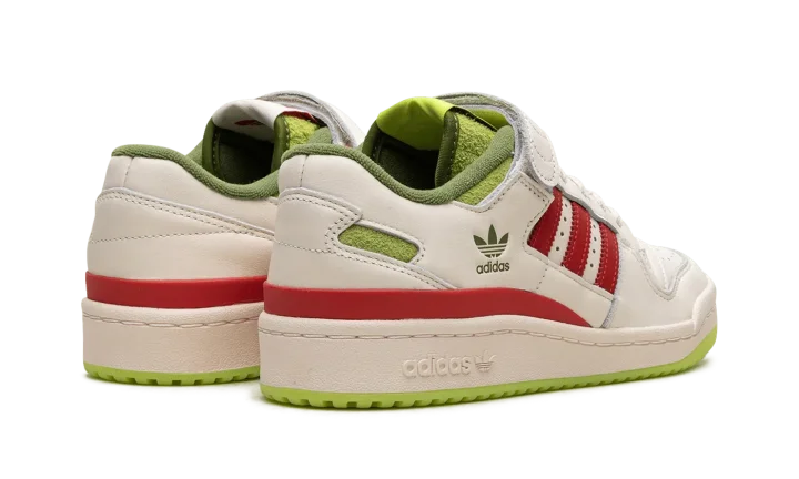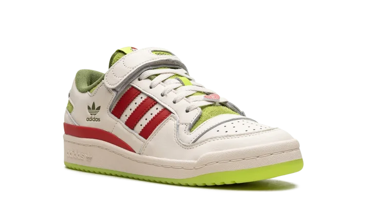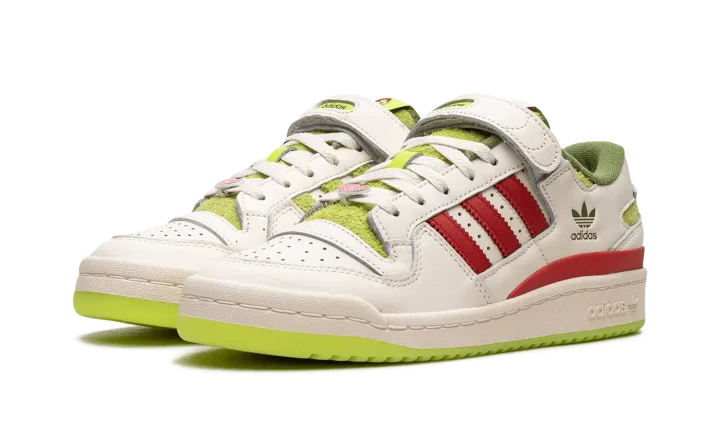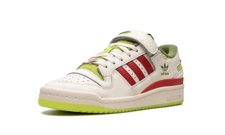 The adidas Forum Low "The Grinch" is a colorway of the retro basketball shoe inspired by the Dr. Seuss character of the same name. From a collection of "Grinch" inspired colorways in celebration of the Christmas season, the Forum Low seen here features details inspired by The Grinch's unmistakable green appearance. Hairy green suede is applied to the tongue and detailing around the collar. The rest of they upper is constructed in off-white leather with red leather Three Stripes on the sides. A green adidas Trefoil logo is seen on the lateral side of the heel. A graphic of The Grinch appears on the tongue tag and a heart dubrae is found on the bottom of the laces.