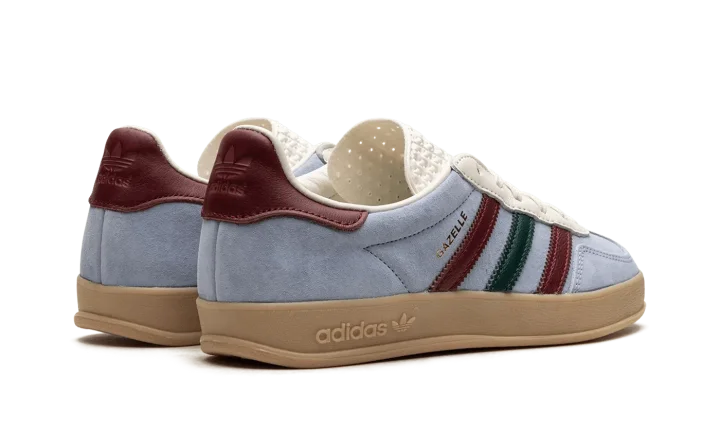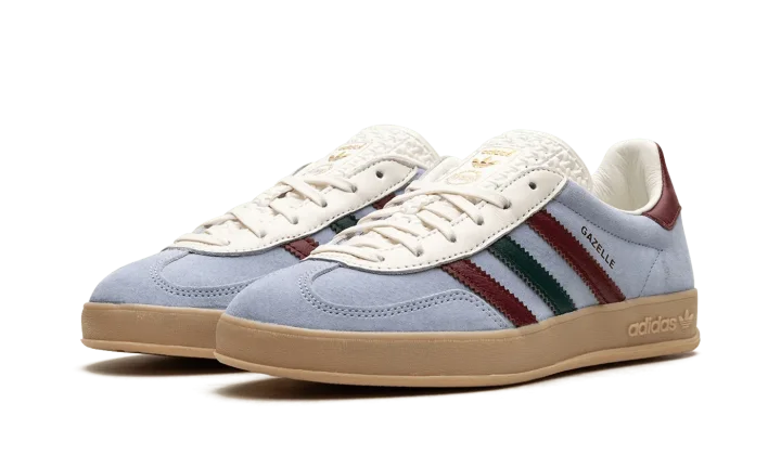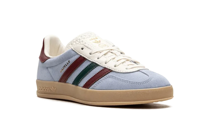 The adidas Gazelle Indoor "Blue Dawn" is a unique colorway of the retro indoor soccer shoe with a casual look. The colorway features a Blue Dawn suede construction with a cream leather eyestay and cream leather tongue. The sneaker's iconic Three Stripes branding is designed in burgundy and green stripes on the sides. Additional burgundy accenting appears on the leather heel tab with debossed "adidas" detailing. A gum rubber sole with an "adidas" logo on the lateral side of the heel completes the look.