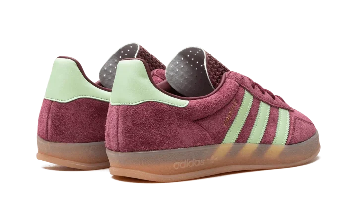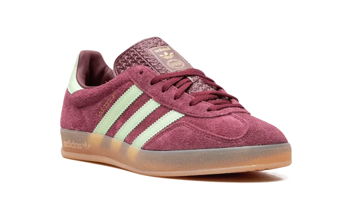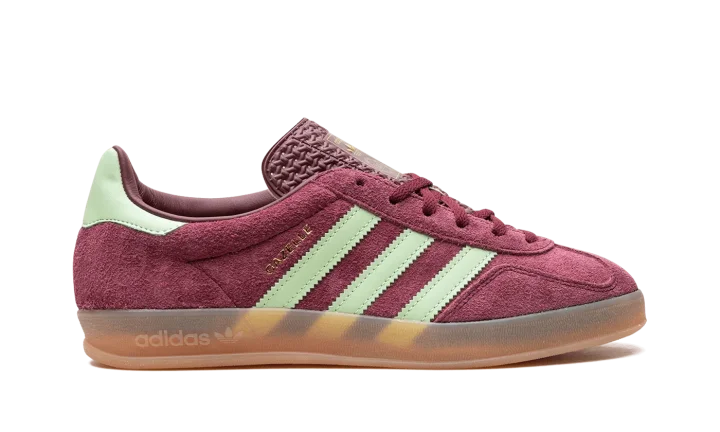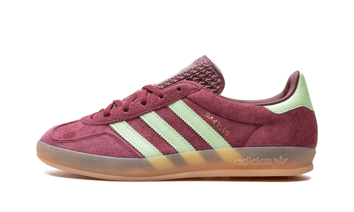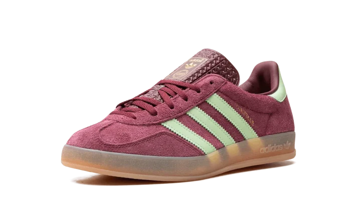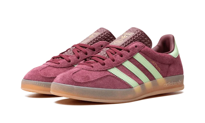 The adidas Gazelle Indoor "Shadow Red/Semi Spark Green" is a colorway of the retro shoe with a bold, eye-grabbing red look. On the adidas Gazelle Indoor "Shadow Red/Semi Spark Green," the upper is complete with a Shadow Red suede construction with Semi Spark Green leather Three Stripes on the sides. More Semi Spark Green accenting can be found on the leather heel tab. Gold "Gazelle" branding appears on the lateral side of the midfoot. A semi-translucent Gum rubber midsole completes the look.