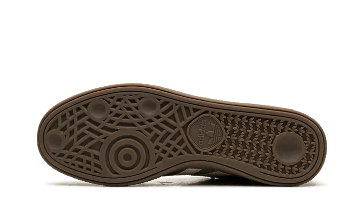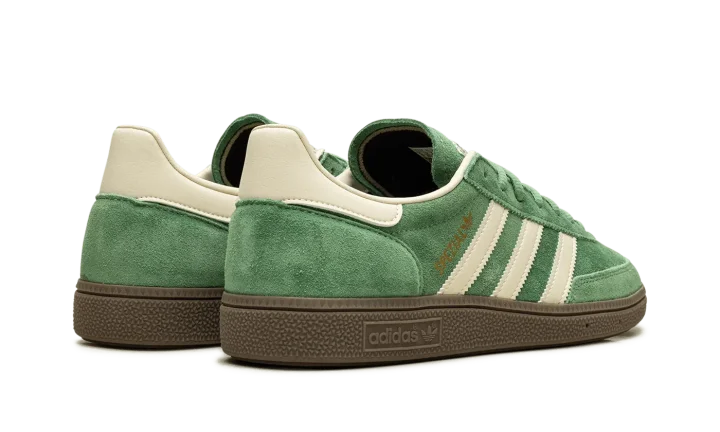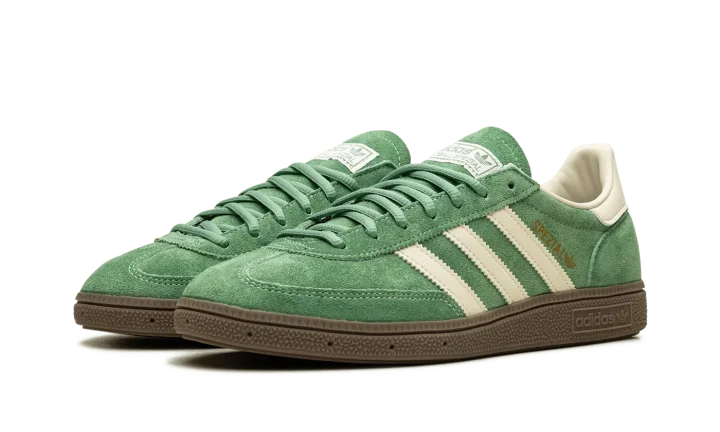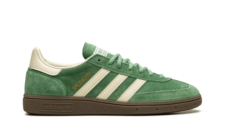 The adidas Handball Spezial "Preloved Green" is a green-based colorway of the classic sneaker. The "Preloved Green" adidas Handball Spezial features a slightly faded green suede construction with tonal suede overlays. Cream leather Three Stripes branding on the sides. Gold "Spezial" and adidas Trefoil logos appear on the lateral side of the mid-panel, while "adidas" branding appears on the white leather heel tab. A brown sole completes the look.