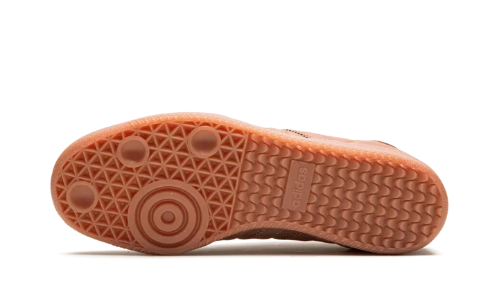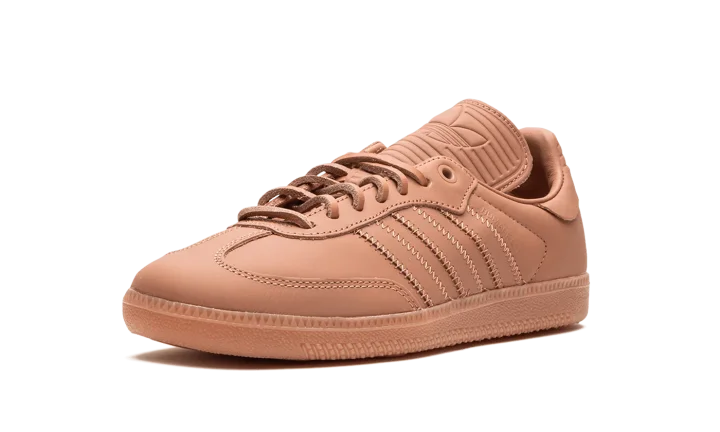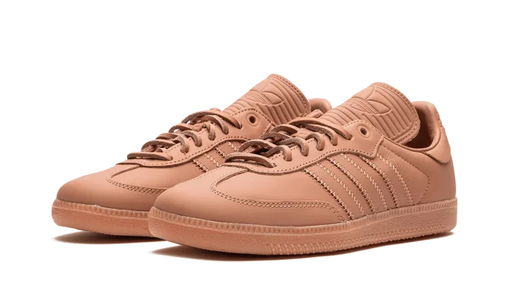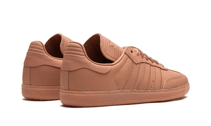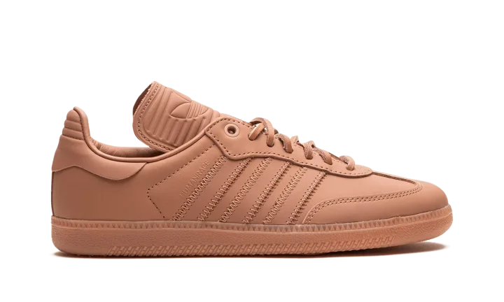 The Pharrell x adidas Samba Humanrace "Terracotta" is a collaboration by Pharrell Williams's lifestyle brand on a monochromatic deep burnt orange colorway of the retro sneaker. One of several adidas Sambas by Humanrace with a monochromatic appearance, the "Terracotta" has a dark orange leather design. Tonal leather Three Stripes branding and a "Humanrace" logo are seen on the sides. An elongated tongue gives the Samba by Humanrace a vintage soccer shoe look. The Terracotta-colored laces and rubber outsole complete the look.