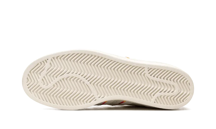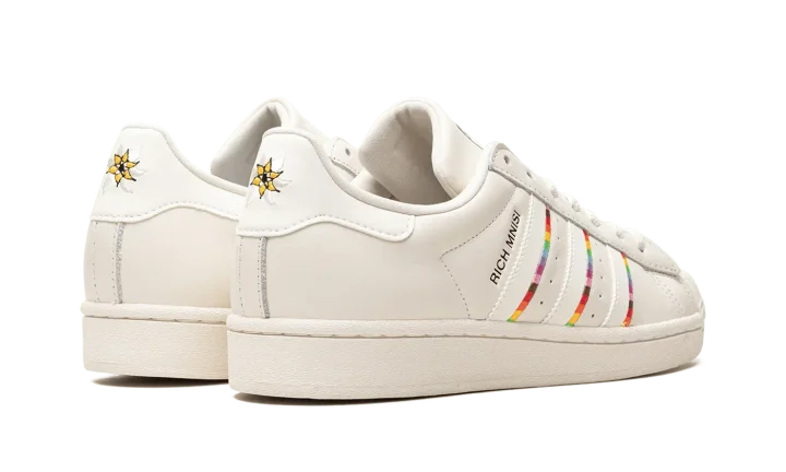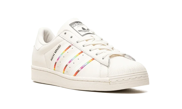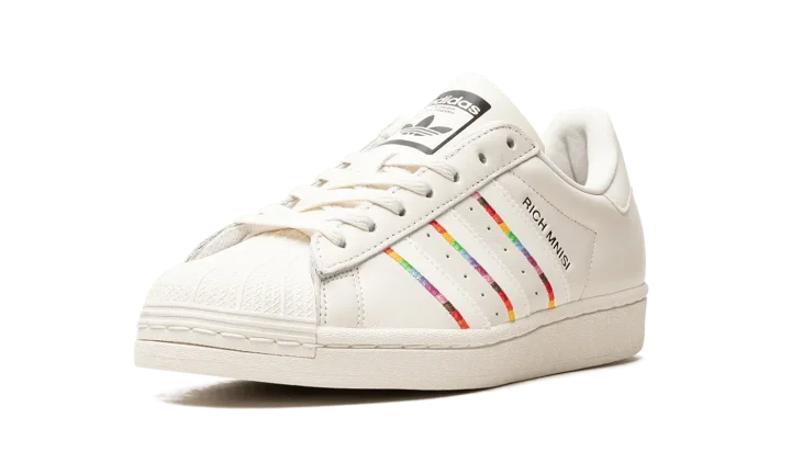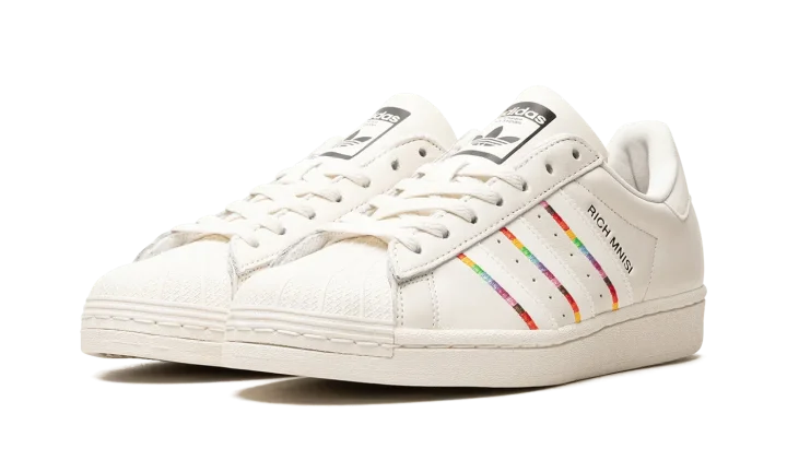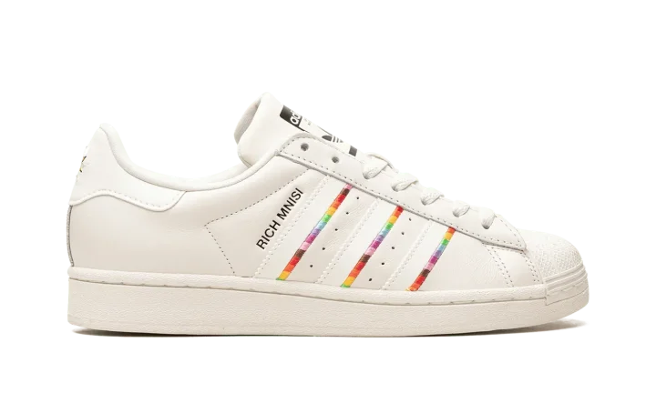 The RICH MNISI X Superstar 'Pride' shoe features a vibrant design that celebrates LGBTQ+ pride, blending classic Adidas Superstar style with Rich Mnisi's distinctive artistic flair.