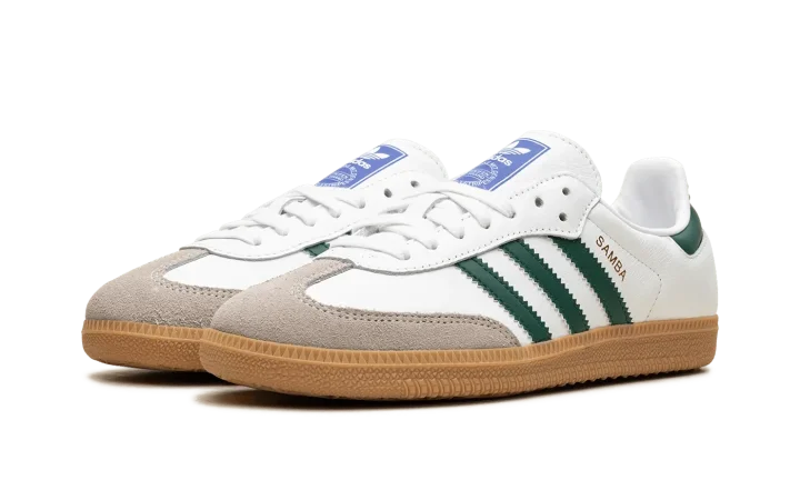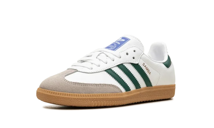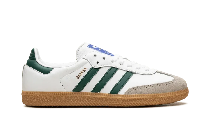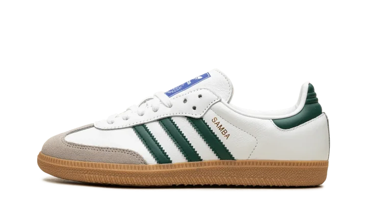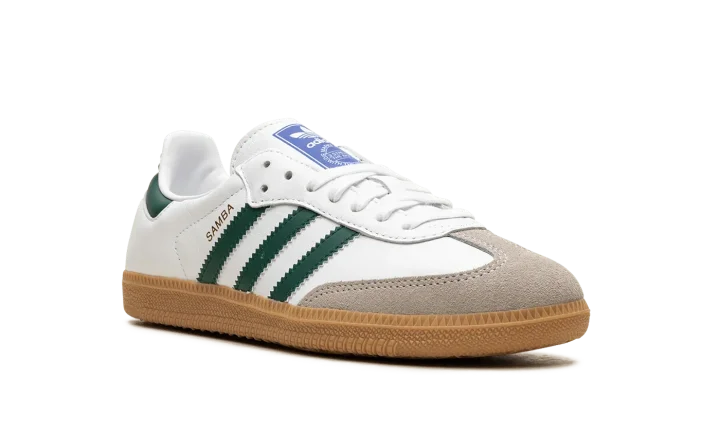 The adidas Samba OG "Collegiate Green" is a colorway of the retro shoe with green accents. The upper features a white leather base contrasted with a grey suede overlay on the toe, and a green leather panel on the heel tab. Collegiate Green leather Three Stripes appear on the sides, while a gold foil "Samba" logo can be seen on the lateral side of the mid-panel. Classic adidas Samba detailing is printed on the tongue. A gum rubber sole completes the look.