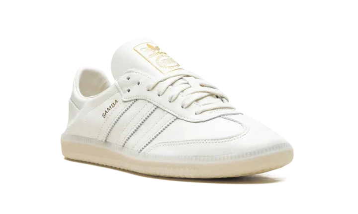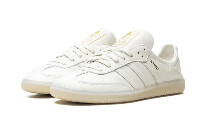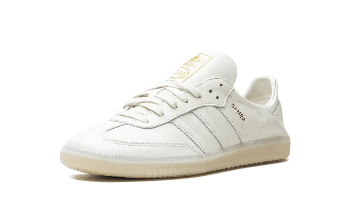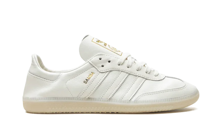 The adidas Samba Decon "Ivory" is a versatile, monochromatic white colorway of the modified version of the classic shoe. The adidas Samba Decon is a stripped-back version of the popular footwear style that has a more streamlined silhouette. On the "Ivory" colorway, the shoe features an Ivory leather upper with tonal leather Three Stripes branding on the sides. A gold "Samba" logo appears on the lateral side of the profile, while gold "adidas" branding is seen on the thin leather tongue. A semi-translucent cream-colored rubber sole completes the look.