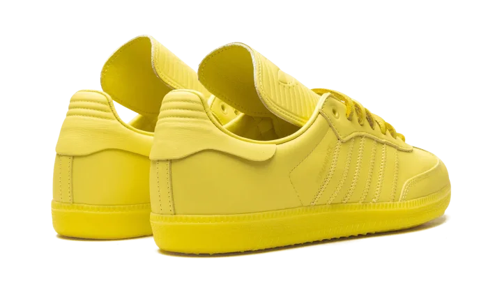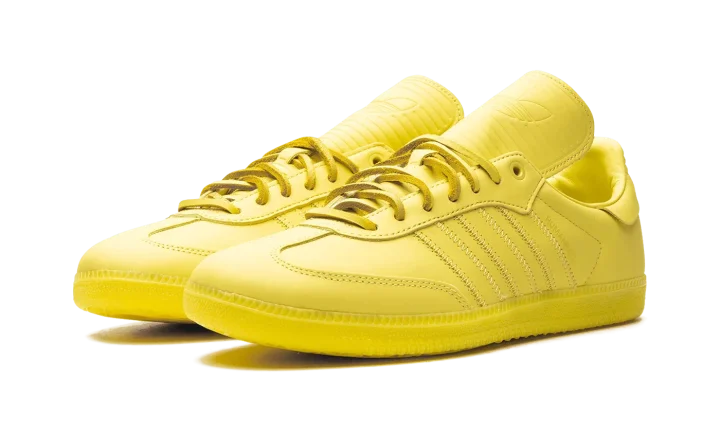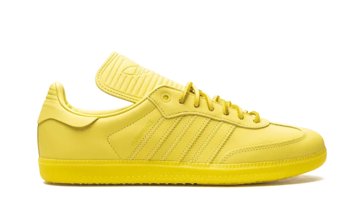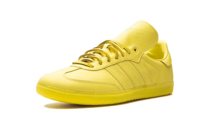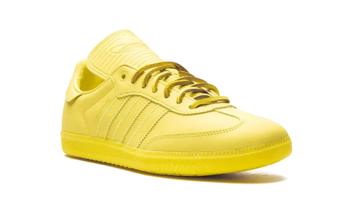The Humanrace x adidas Samba "Yellow" is a collaboration by Pharrell's lifestyle brand and adidas on an all-yellow colorway of the retro soccer shoe. From a greater collection of Sambas designed in monochromatic colorways, the "Yellow" has a bright yellow leather construction. Yellow leather Three Stripes branding and a "Humanrace" logo are found on the sides. An elongated tongue gives the Samba by Humanrace a vintage soccer shoe aesthetic. Brown leather laces contrast the yellow upper. A yellow rubber sole rounds out the look.