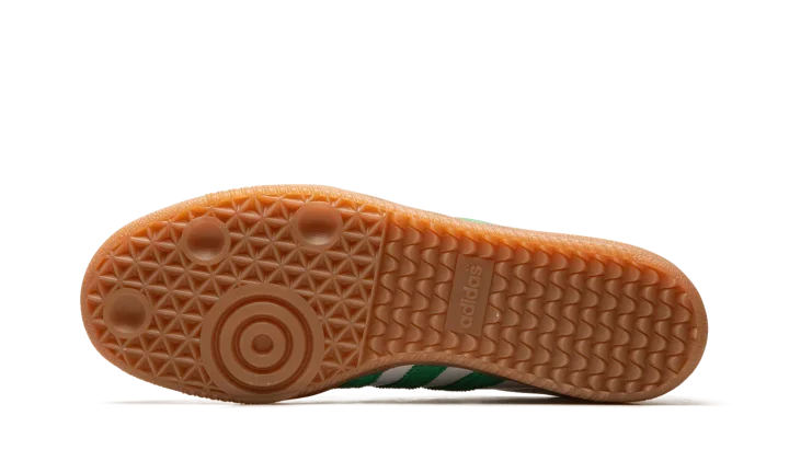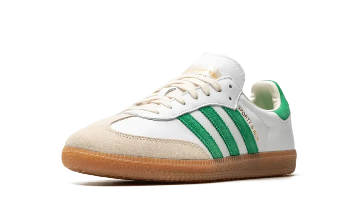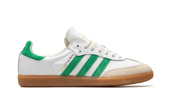 The Sporty and Rich x adidas Samba is a collaboration between Emily Oberg's sportswear brand and adidas on the ultra popular lifestyle shoe. The Sporty and Rich co-designed adidas Samba features a white leather base with a tan suede overlay on the toe. A green suede Three Stripes logo appears on the side, as does gold "Sporty and Rich" branding. Dual "adidas" and "Sporty and Rich" detailing is found on the green suede heel tab. Classic adidas Samba branding dots the tongue. A gum rubber sole completes the look.