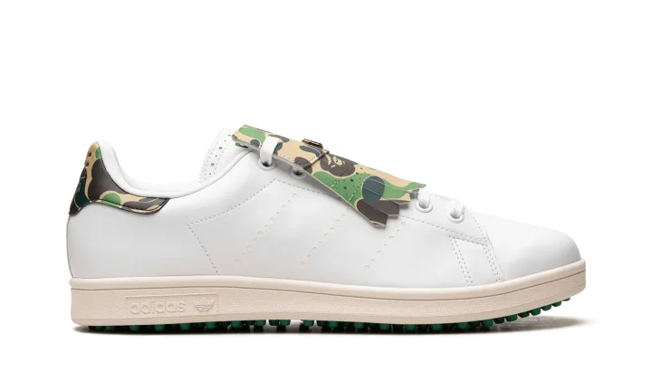 The BAPE x adidas Stan Smith Golf is a collaboration by the Japanese streetwear brand and adidas on a colorway of the golf version of the classic sneaker. The adidas Stan Smith Golf is a modified version of the old school tennis shoe made for golfing. Here, BAPE chooses the silhouette to be part of its collaboration with adidas in celebration of its 30th anniversary. As for the design of the shoe, the upper features a white leather construction with a removable lace kilt lace cover in BAPE's iconic "ABC Camo" pattern. The print also appears on the heel tab. Co-branding is seen on the tongue. An aged midsole and rubber spikes on the outsole complete the design.