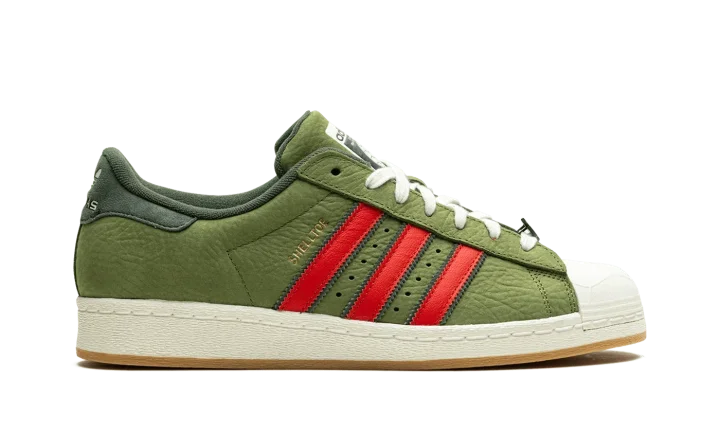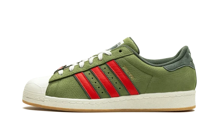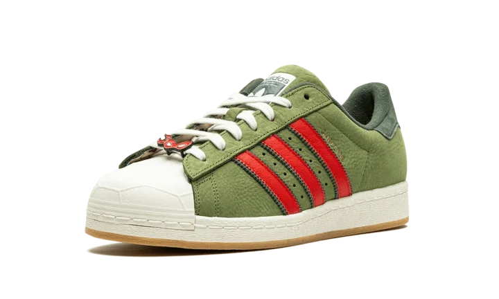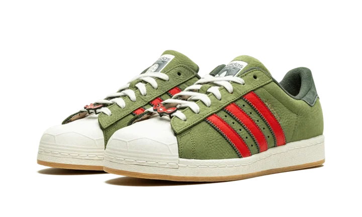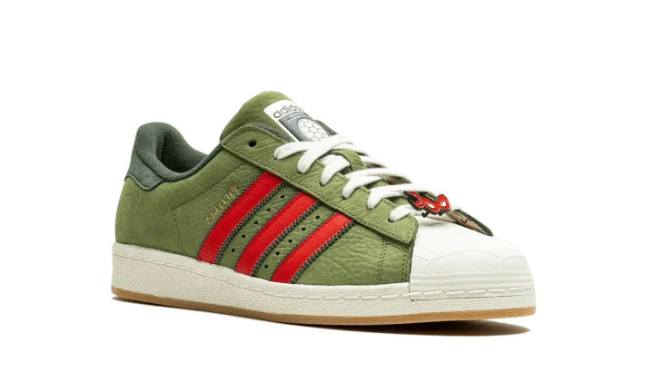 The Superstar 'Teenage Mutant Ninja Turtles - Shelltoes' shoe features a design inspired by the iconic cartoon, blending classic Adidas Superstar style with unique Teenage Mutant Ninja Turtles details on the shell toe.