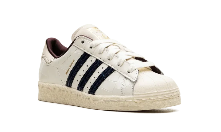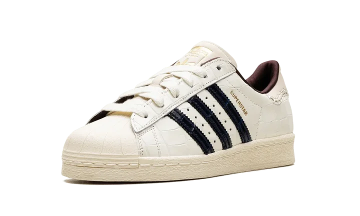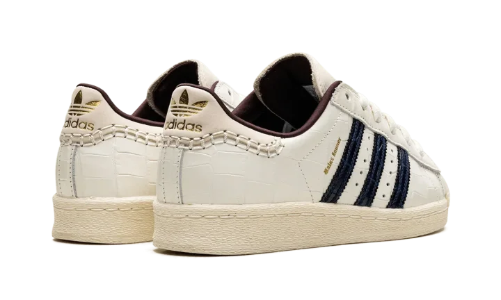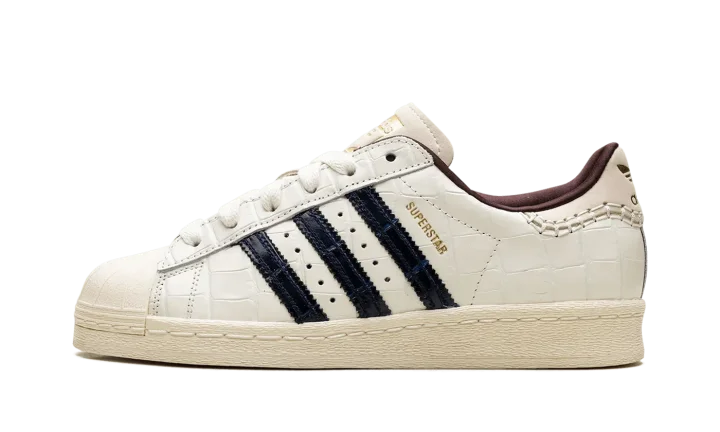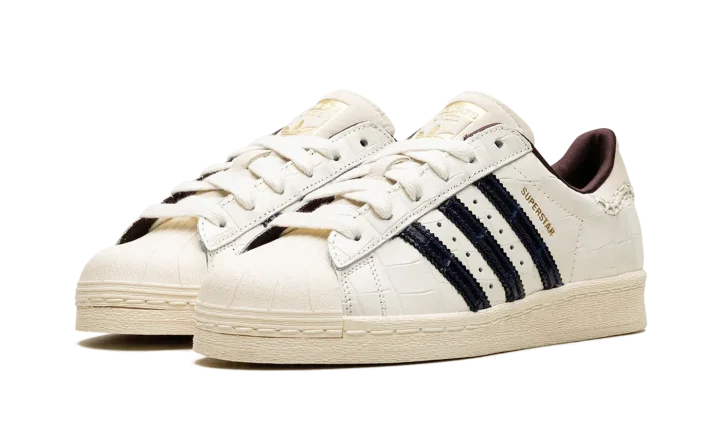 The Superstar 'Wales Bonner - White Croc' shoe blends classic Adidas Superstar style with a unique croc-embossed design, offering a sophisticated and distinctive look.