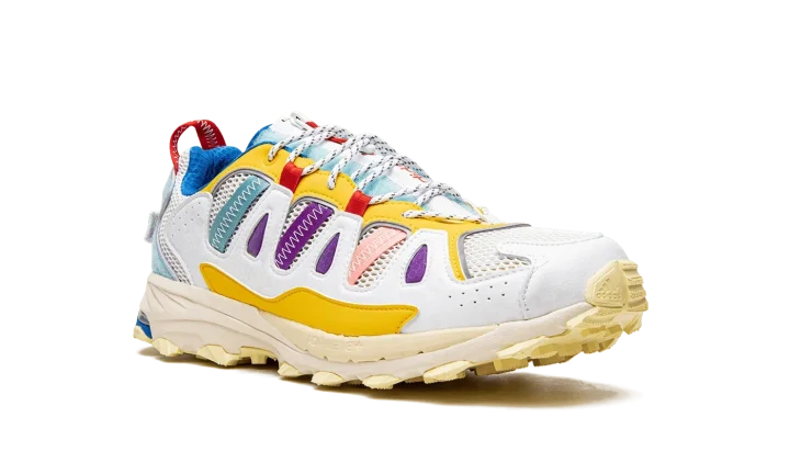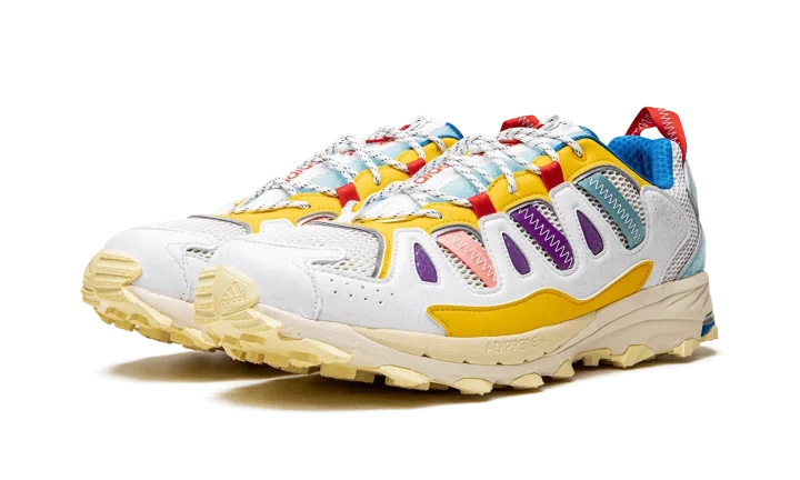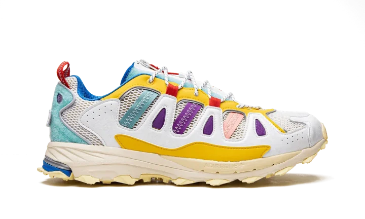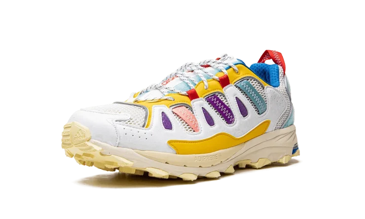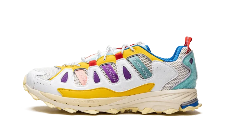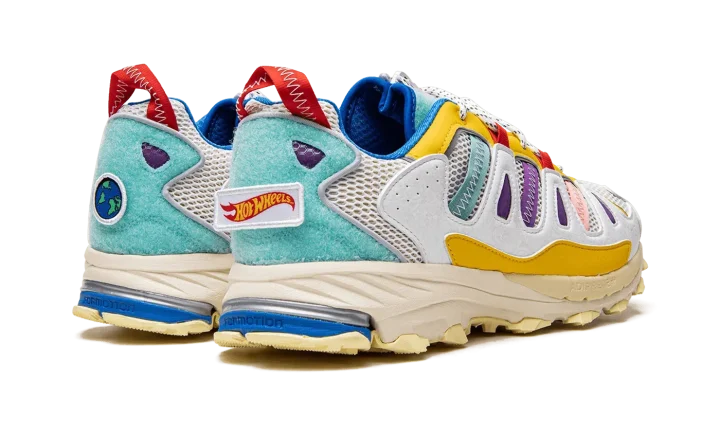 The Sean Wotherspoon x Hot Wheels x adidas Superturf Adventure is a fun collaboration that brings together the footwear designer and vintage curator, the toy manufacturer, and adidas on an eye-catching colorway of the lifestyle shoe. Wotherspoon and adidas's Superturf Adventure gets a creative boost from none other than Mattel's Hot Wheels, the toy car manufacturer, and it doesn't disappoint. The upper features a white mesh base with tonal leather overlays. Colorful nylon straps are found on either side of the shoe. A yellow eyelet panel and teal overlay on the heel add to the look. Hot Wheel's signature slogan, "It Ain't the Same Without the Flame" appears on the tongue. Velcro patches in the form of a globe on the heel of the left shoe and a "Hot Wheels" logo on the heel of the right shoe complete the look. This shoe is made from recycled and vegan content.