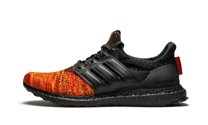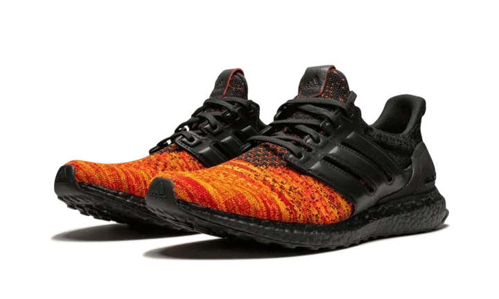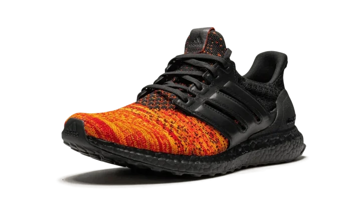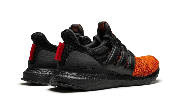 The Game of Thrones x adidas Ultra Boost "Targaryen Dragons" is one of the most popular colorways from the epic set of Ultra Boost colorways inspired by the beloved HBO series. This version represents the House of Targaryen and its dragons with a fiery Primeknit upper. The toe is covered in red, orange, and yellow to represent flames. The colors transition to solid black Primeknit at the rear of the shoe. All other details are also in black, including the leather cage, matte-finished heel counter, and the painted Boost midsole. A tab on the heel states "FIRE AND BLOOD" to summarize the aura of the Targaryen family. This Game of Thrones x adidas Ultra Boost "Targaryen Dragons" released on March 22, 2019.