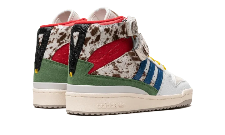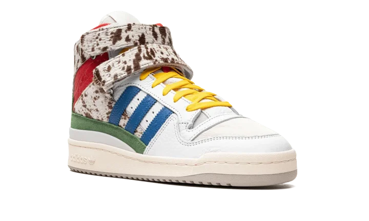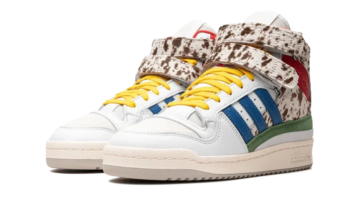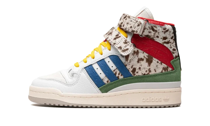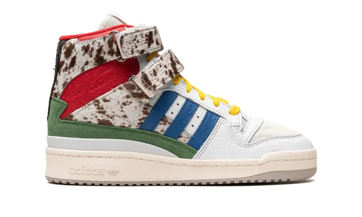 The Tulie Yaito x Women's adidas Forum '84 High "Crystal White/Surf Blue" is a women's-exclusive colorway of the retro basketball shoe designed by the accessories designer. Yaito's popular knot and Keijō bags are the inspiration for the shoe, which features exotic animal print on its design. The shoe has a white pebbled leather upper with faux pony hair and cowhide adjustable straps. Blue and red ostrich embossed leather is seen on the Three Stripes on the side and on the collar, respectively. The vibrant design is inspired by Yaito's Jamaican roots.