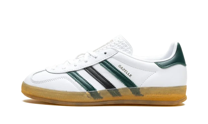 The Women's adidas Gazelle Indoor "Celtics" is the women's sizing of the retro indoor soccer shoe in a Boston Celtics-inspired colorway. While not associated with the NBA team, the "Celtics" adidas Gazelle Indoor features the Celtics uniform colors on its design, giving the shoe a classic look. The upper is complete with a white leather base, while green and black leather Three Stripes appear on the sides. A gold "Gazelle" logo can be seen on the lateral side of the mid-panel, while a green leather panel appears on the heel. Classic "adidas" detailing is located on the tongue. A semi-translucent gum rubber sole completes the look.