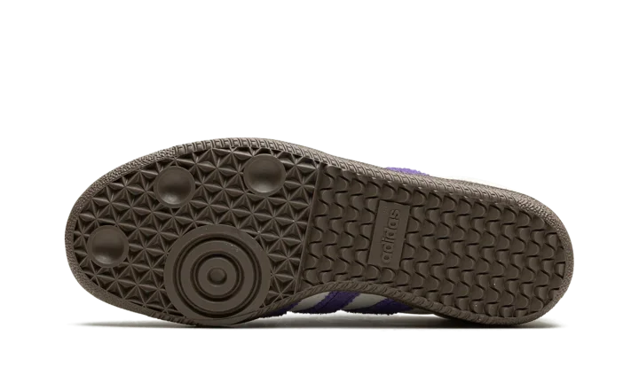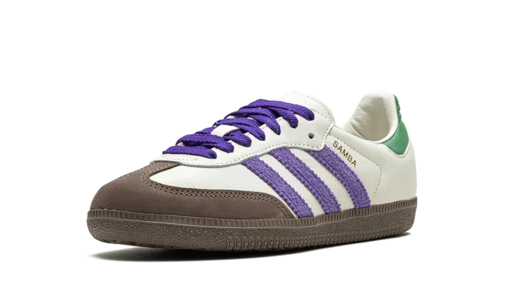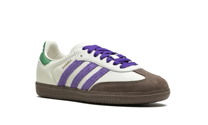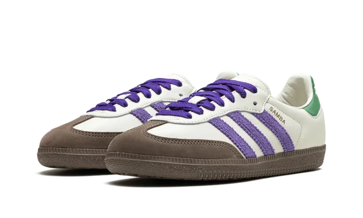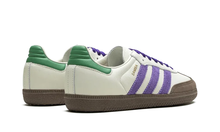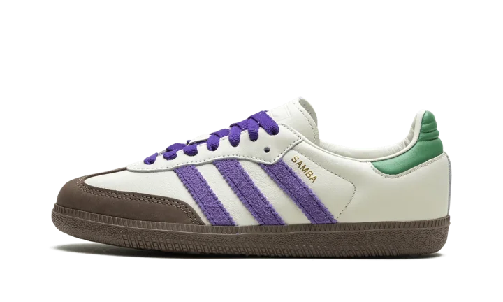 The Women's adidas Samba OG "Collegiate Purple" is a women's-exclusive colorway of the classic sneaker with a multi-color look. The upper features a white leather base that is contrasted with a brown suede overlay on the toe, and a green leather panel on the heel tab. Collegiate Purple suede Three Stripes appear on the sides, while a gold foil "Samba" logo can be seen on the lateral side of the mid-panel. Classic adidas Samba detailing is printed on the tongue. A brown rubber sole completes the look.