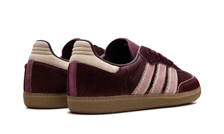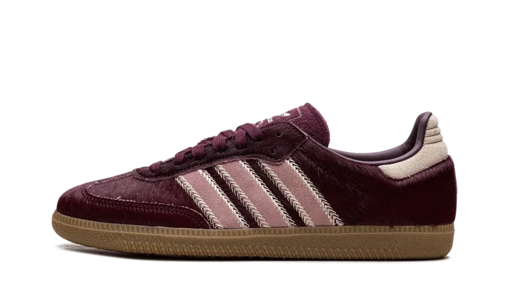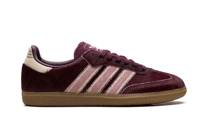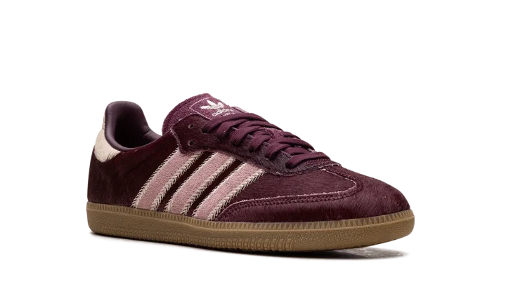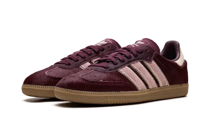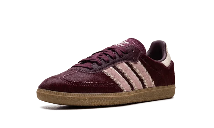 Elevate your style with the Wmns Samba OG, also known as the "Maroon Sand Strata Pony". This unique take on the classic Samba silhouette features distinctive materials like pony hair, adding a touch of luxury to the sporty design. The Maroon and Sand Strata tones offer a sophisticated color palette, while the iconic Samba details remain.