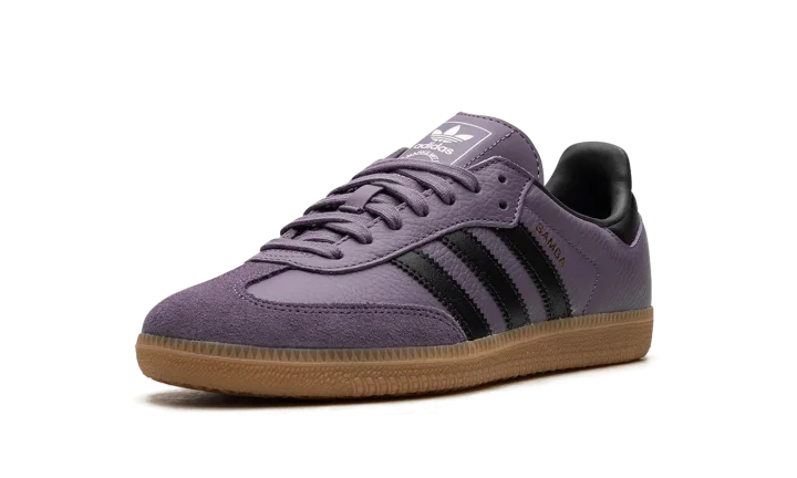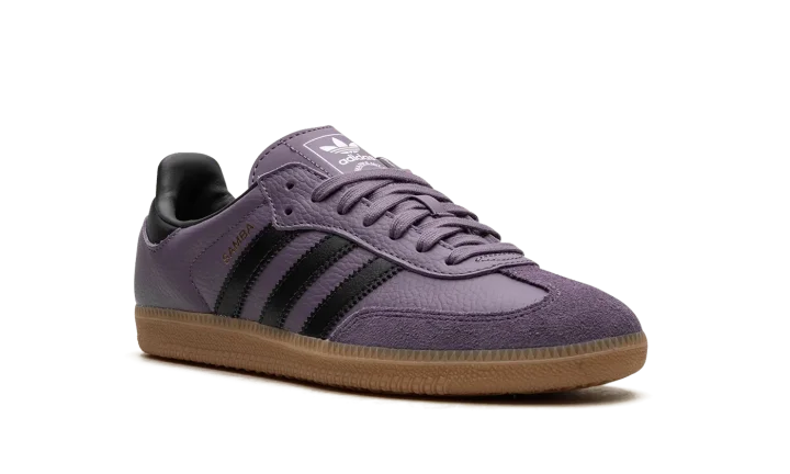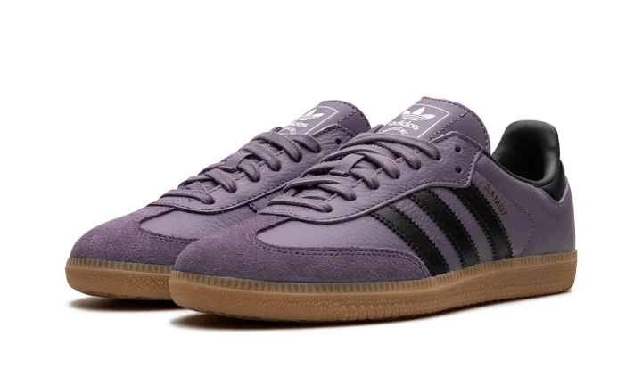 The Women's adidas Samba OG "Shadow Violet" is a women's colorway of the retro indoor soccer sneaker with a purple-based appearance. The shoe is complete with a Shadow Violet leather upper and tonal suede overlays. The Three Stripes branding on either side of the shoe is rendered in black leather. A gold "Samba" logo appears on the lateral side of the mid-panel. Classic adidas insignia is found on the tongue. A gum rubber sole finishes off the appealing colorway.