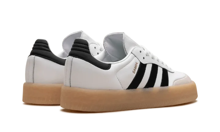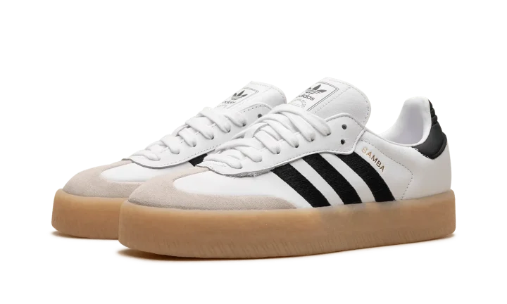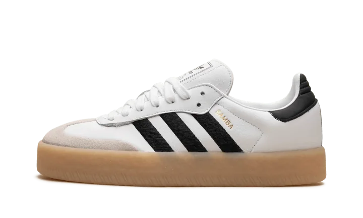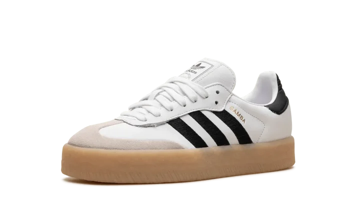 The adidas Sambae "White/Black" is a modified version of the retro sneaker with contemporary design features. Based on the adidas Samba OG, the Sambae has a thick rubber midsole that gives the shoe a platform-style appearance. The "White/Black" colorway features a white leather construction with a tan suede overlay on the toe. Black Three Stripes branding is located on the sides. A gold "Samba" logo appears on the lateral side of the mid-panel, while an "adidas" logo can be seen on the tongue. The platform sole in gum rubber completes the look.