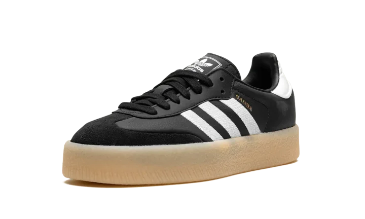 The adidas Sambae "Black/White" is an alternate version of the classic sneaker with contemporary design features. Based on the adidas Samba OG, the Sambae has a thick rubber midsole that gives the shoe a platform-style appearance. Here, the "Black/White" colorway features a black leather construction with a tonal suede overlay on the toe. White embroidered Three Stripes branding is located on the sides. A classic "Samba" logo appears on the lateral side of the mid-panel, while an "adidas" logo can be seen on the tongue. The platform sole in gum rubber completes the design.