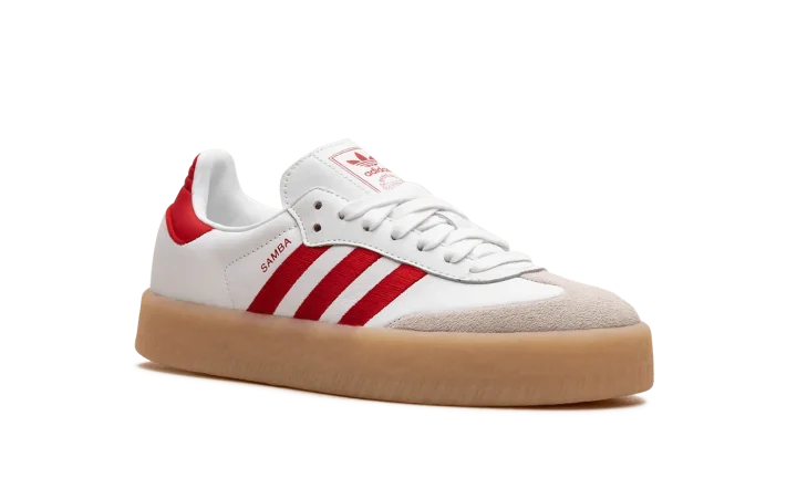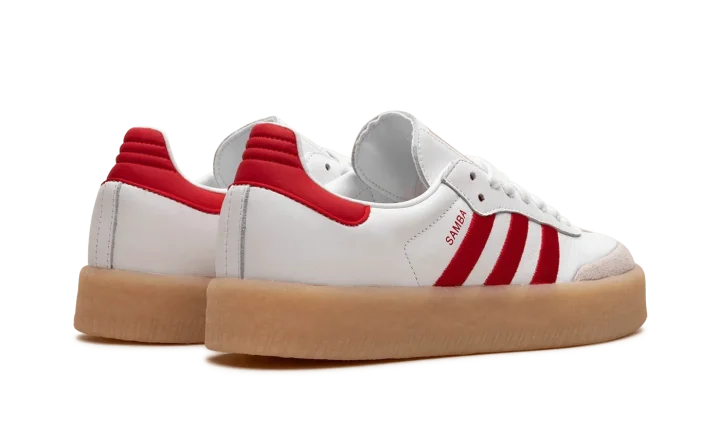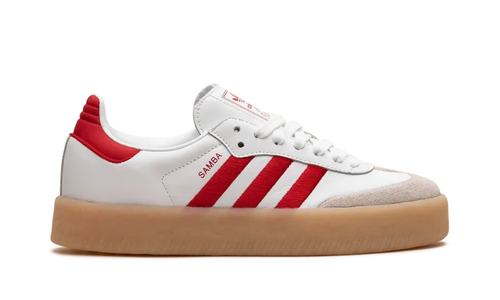 The adidas Sambae "White/Scarlet" is a modified version of the popular retro sneaker with contemporary design features. Based on the iconic adidas Samba model, the Sambae has a thick rubber midsole that gives the shoe a platform-style appearance. On this "White/Scarlet" colorway, the upper features a white leather construction with a tan suede overlay on the toe. Scarlet Three Stripes branding is located on the sides. A red "Samba" logo appears on the lateral side of the mid-panel, while an "adidas" logo can be seen on the tongue. The platform sole in gum rubber completes the look.
