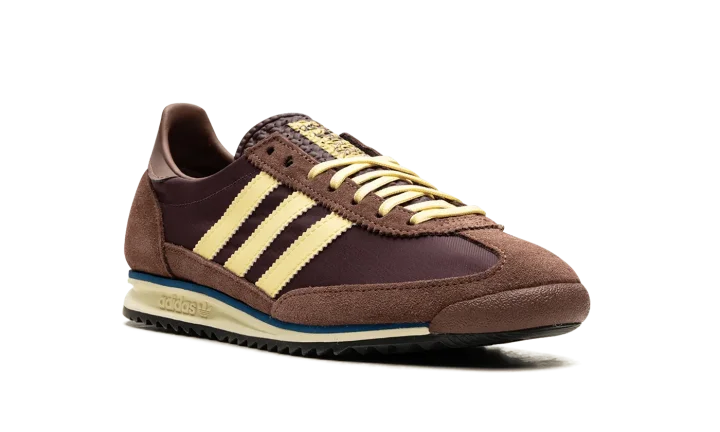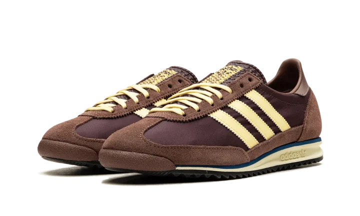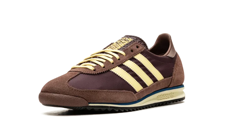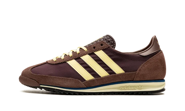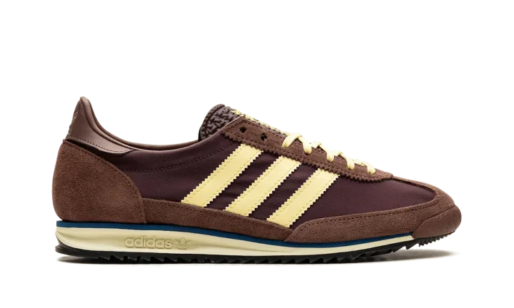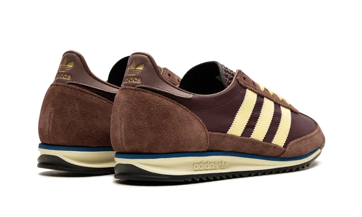 The adidas SL 72 OG Maroon Preloved Brown presents a classic, streamlined aesthetic. Dark brown textile meets light brown suede overlays, creating rich texture. Beige 3-Stripes offer subtle contrast, complemented by gold adidas logos on the heel and tongue. A slim rubber outsole, embossed with the brand's logo, honors its heritage. This sneaker balances retro style with everyday practicality. Its slim silhouette and refined details make it a versatile choice, combining timeless design with comfortable wearability.