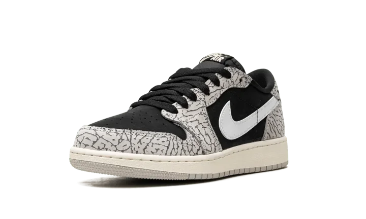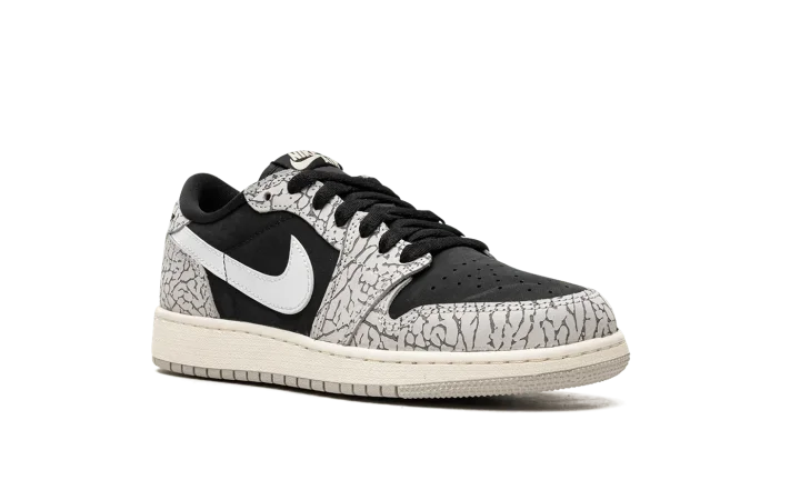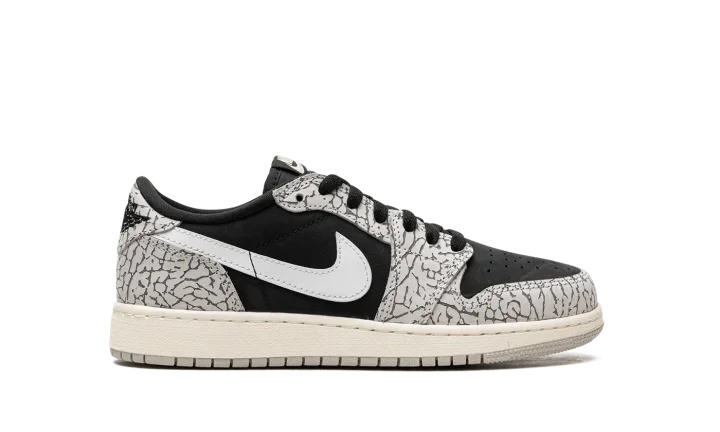 The Air Jordan 1 Low OG GS "Elephant Print" is the youth sizing of the vintage basketball shoe that incorporates a classic patterning of the Air Jordan 3. From Jordan Brand's "Elephant" collection, the "Elephant Print" Jordan 1 Low OG nods to the Air Jordan 3 by featuring its iconic elephant pattern across the upper. The shoe's base is designed in black leather. A white leather Swoosh is found on either side. Classic "Wings" and "Nike Air" logos appear on the heel and tongue tag, respectively. Release date: June 23, 2023