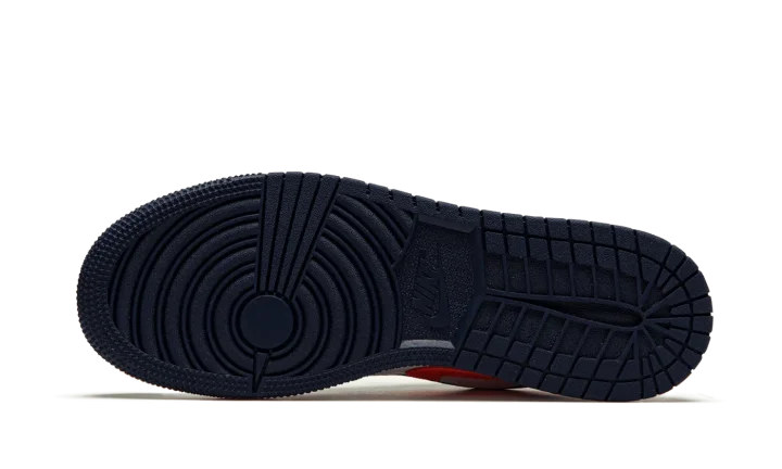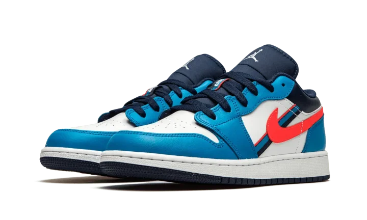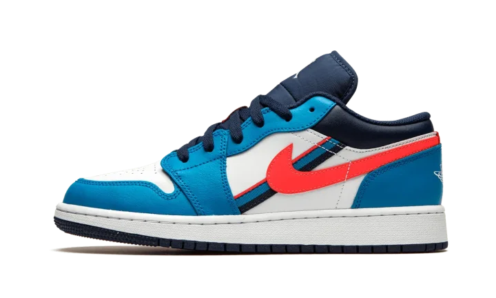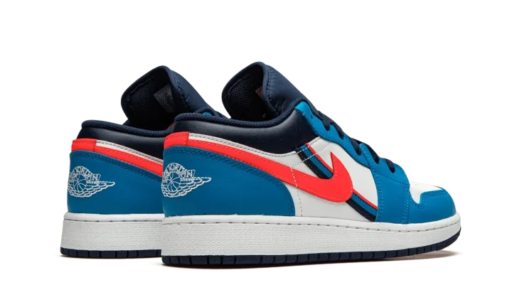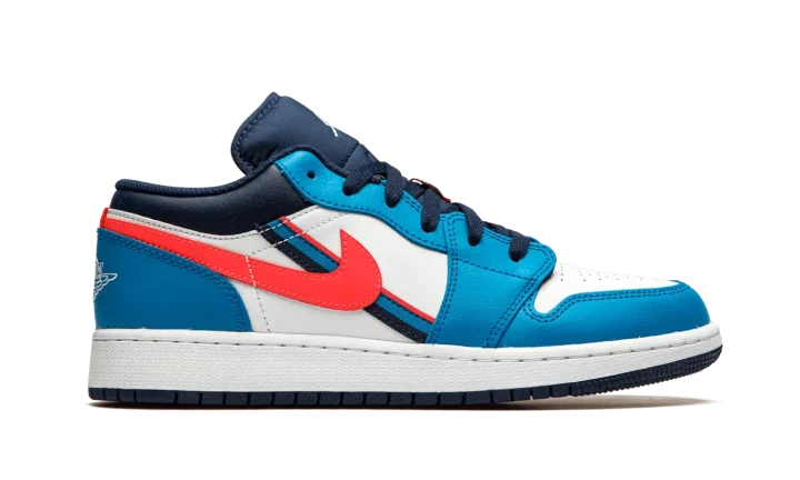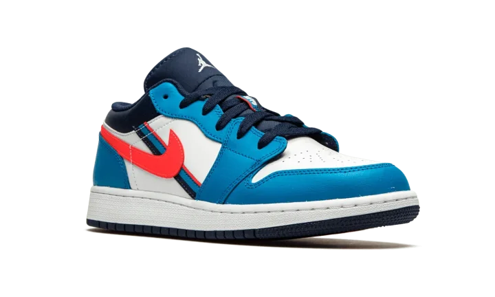 The Air Jordan 1 Low GS "Game Time" is the youth sizing of Michael Jordan's first signature shoe in the desirable low-top silhouette. Outfitted in a colorful design that kids will enjoy wearing to school or anywhere else for that matter, the "Game Time" is an intriguing option for the versatile Air Jordan 1. The upper features smooth white leather on the perforated toe and mid-panel. Blue Orbit leather overlays on the forefoot, eyelets, and heel contrast the neutral look. The same holds true for the Flash Crimson leather Swoosh located on either side. Navy blue leather appears around the collar, and tricolor nylon stripe embroidery can be found on the mid-panel.