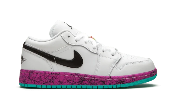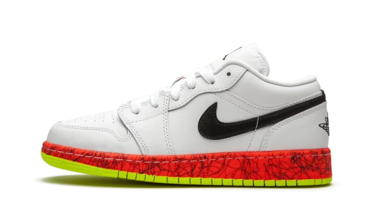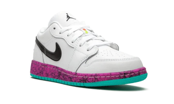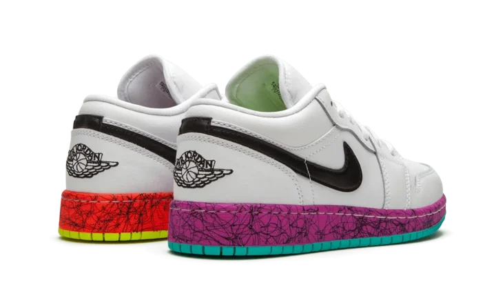 The Air Jordan 1 Low GS "Grades" is the youth sizing of Michael Jordan's first signature shoe in a distinctly '90s-style colorway. The low-top Jordan 1 is one of the most popular shoes in the Jordan lineup, and this "Grades" look, complete with neon orange, yellow, turquoise, and pink accenting is certainly no exception to the statement. A black leather Swoosh appears on either side of the shoe and black "Wings" embroidery can be found on the heel. The rest of the upper is outfitted in crisp white leather for an ultra versatile look. Elsewhere, black Jumpman detailing is stitched onto the white nylon tongue and contrasting "23" embroidery can be found on the lace overlay. An orange midsole with black swirls and a neon green outsole highlight the look of the left shoe. The right shoe features a magenta midsole with black swirls and a turquoise outsole.