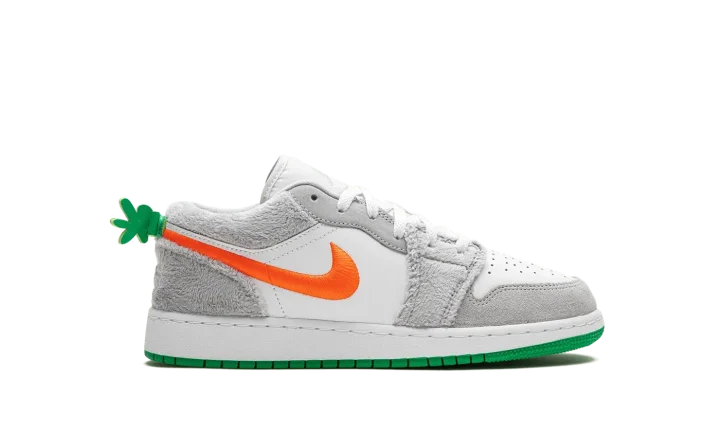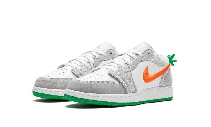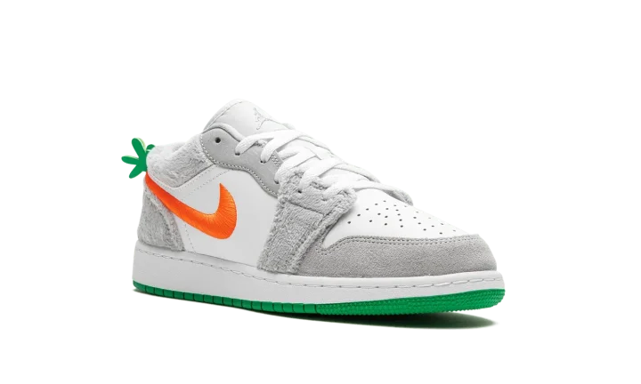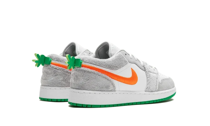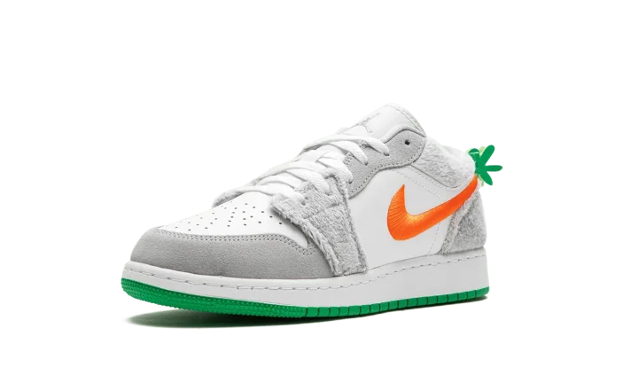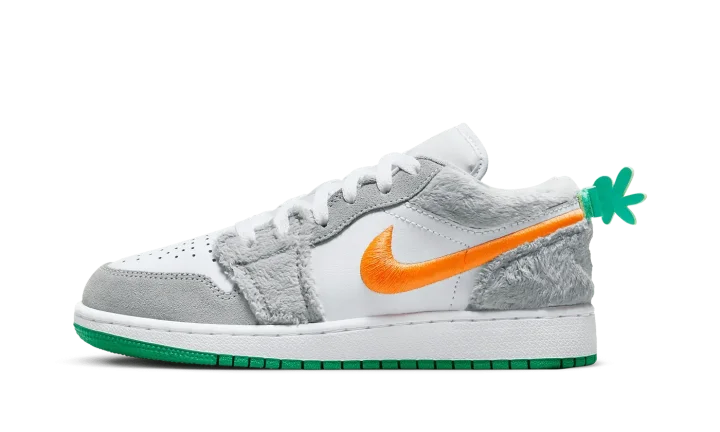 The Air Jordan 1 Low GS "Rabbit" is the youth sizing of the retro basketball shoe in a colorway inspired by Bugs Bunny. While not officially affiliated with Bugs Bunny, the "Rabbit" Jordan 1 Low nonetheless shows love to the cartoon character that famously joined Michael Jordan in the movie "Space Jam" in 1996. The shoe features a white leather base with furry grey overlays no doubt inspired by Bugs. An orange Swoosh is embroidered on the side. A green carrot stem is found on the heel. Release date: August 31, 2023