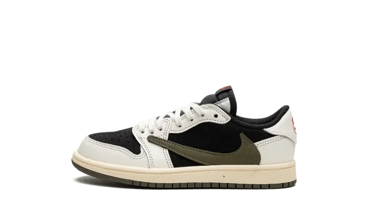 The Travis Scott x Air Jordan 1 Low PS "Olive" is the preschool sizing of the popular collaboration by the hip-hop star on the women's version of the classic sneaker. Travis Scott's Women's Jordan 1 Low "Olive" succeeds Travis's other desirable Air Jordan 1 collaborations that date back to 2019. The "Olive" is reminiscent of his Jordan 1 Low "Reverse Mocha" release, in that it features a similar neutral-colored base with contrasting white leather overlays. The "Olive" features a black base with white leather overlays. An oversized, inverted Olive leather Swoosh appears on each lateral side. Classic red "Nike" and Swoosh branding is found on the tongue. Travis's signature smiley face is embroidered on the left heel while a "Wings" logo is embroidered on the right heel.